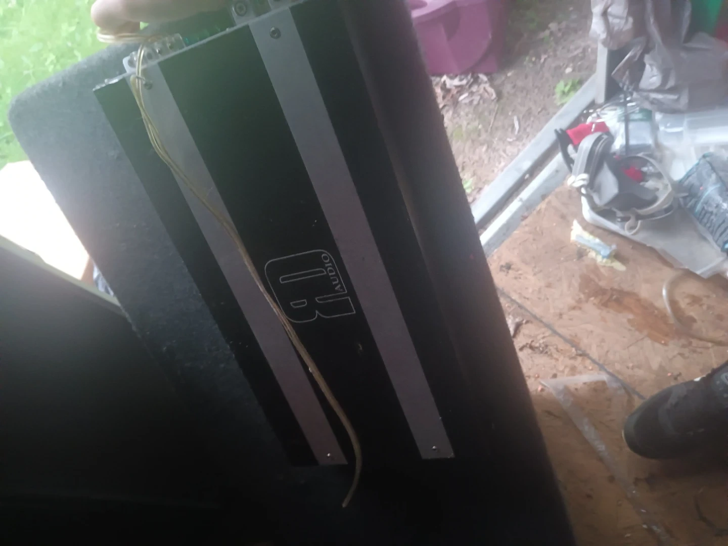 This is a Kicker Comp dual 12-inch subwoofer box. It's covered in grey carpet and features the Kicker logo. The box includes two Kicker Comp subwoofers and an Rd Audio amplifier 1800 watts.This setup is ready for installation in your vehicle!