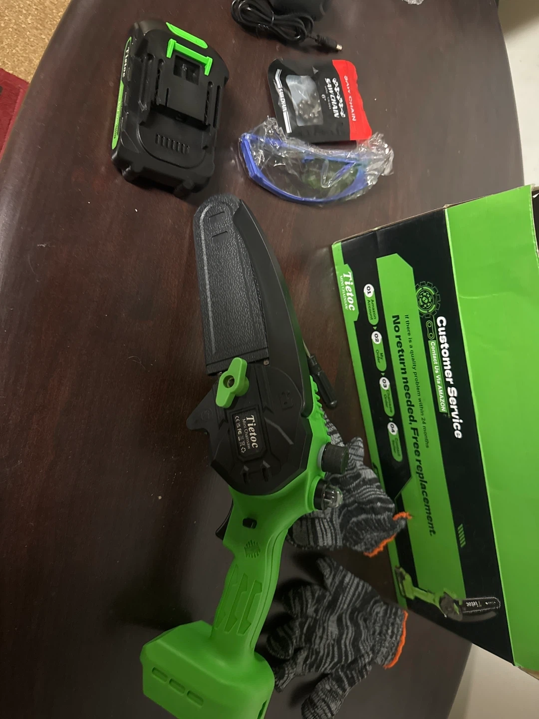 This is a Tietoc mini chainsaw kit. It comes with a battery, charger, safety glasses, and a replacement chain. It's great for pruning and small cutting tasks. Excellent for gardening and light yard work!