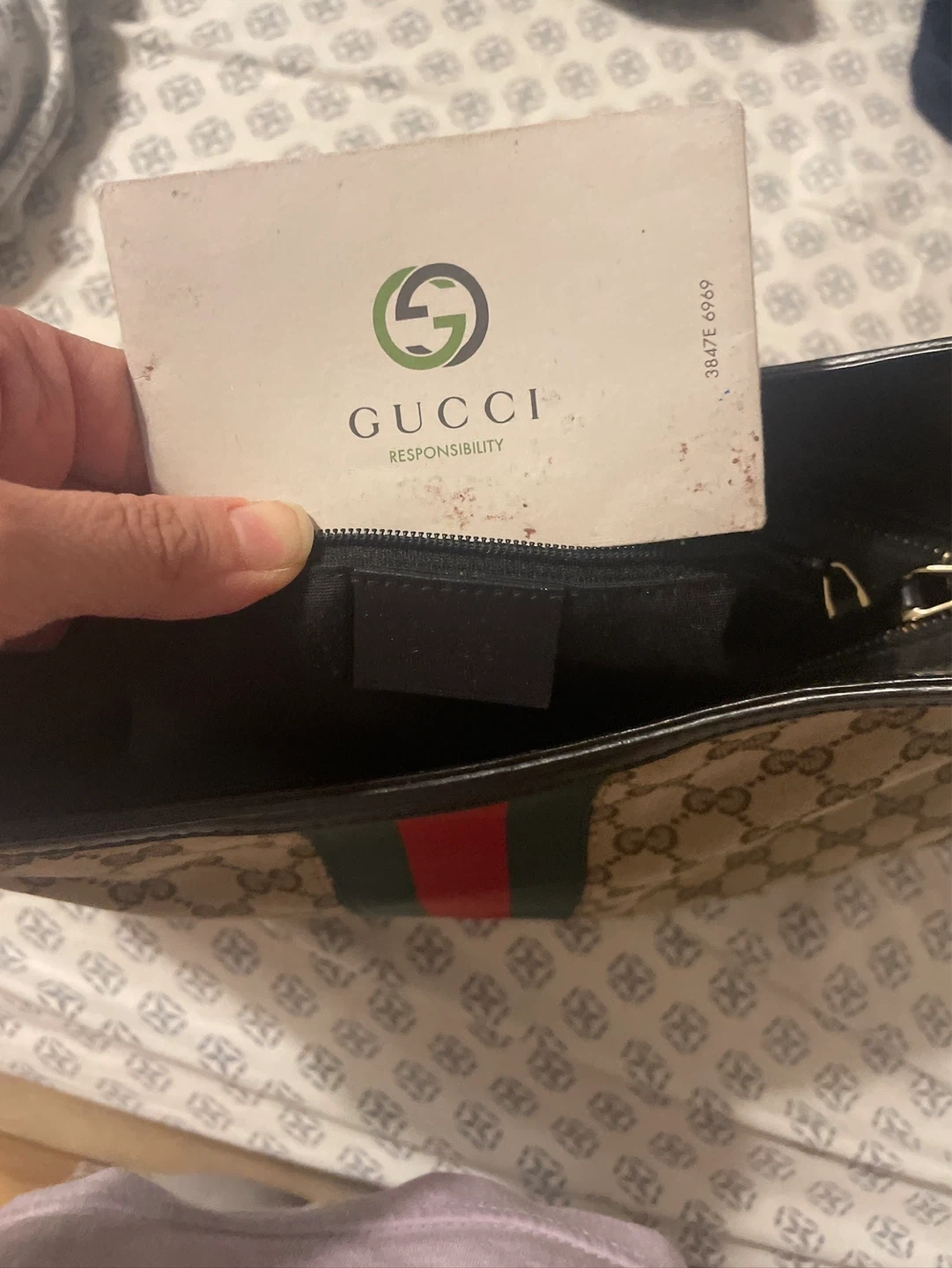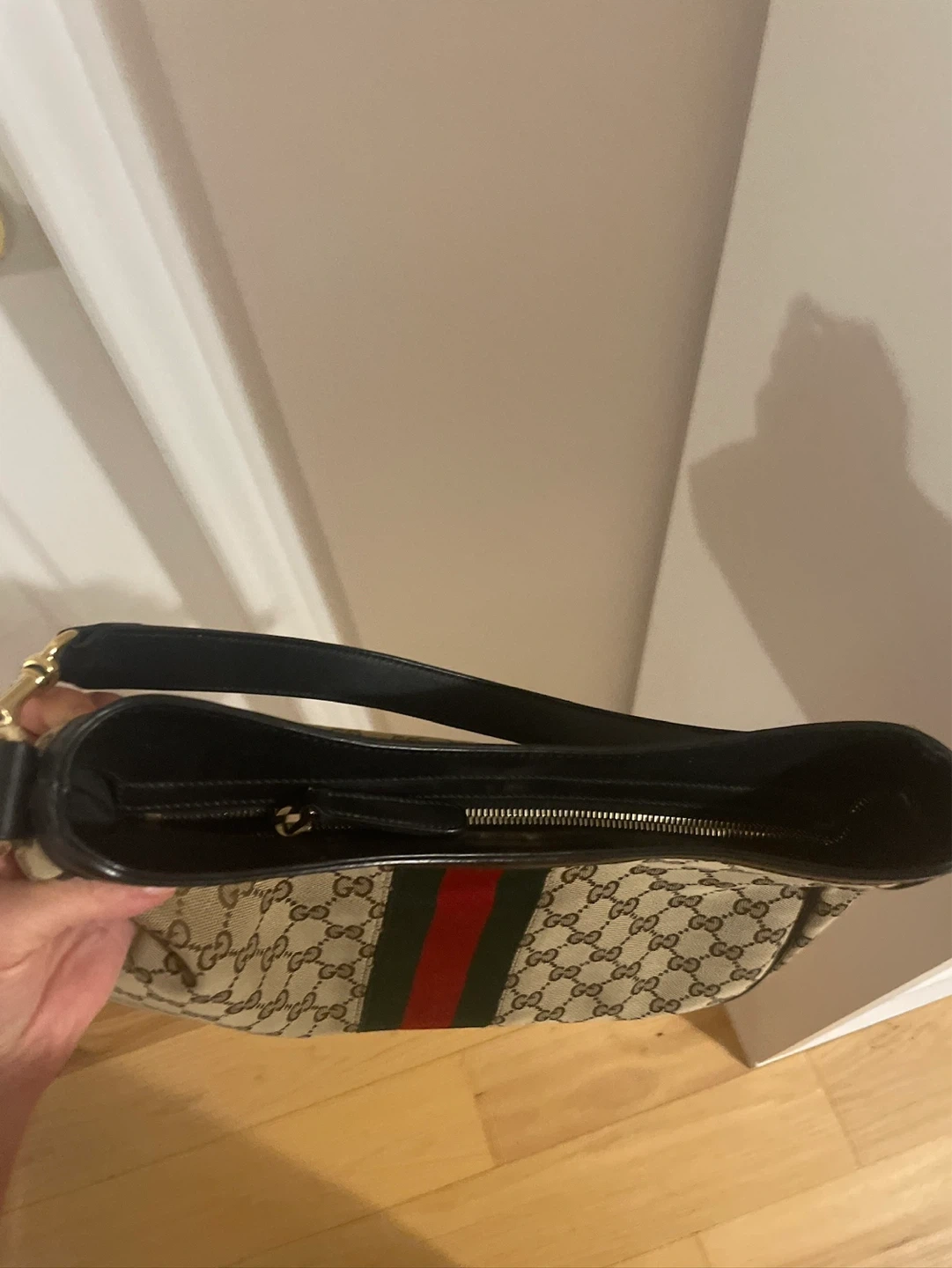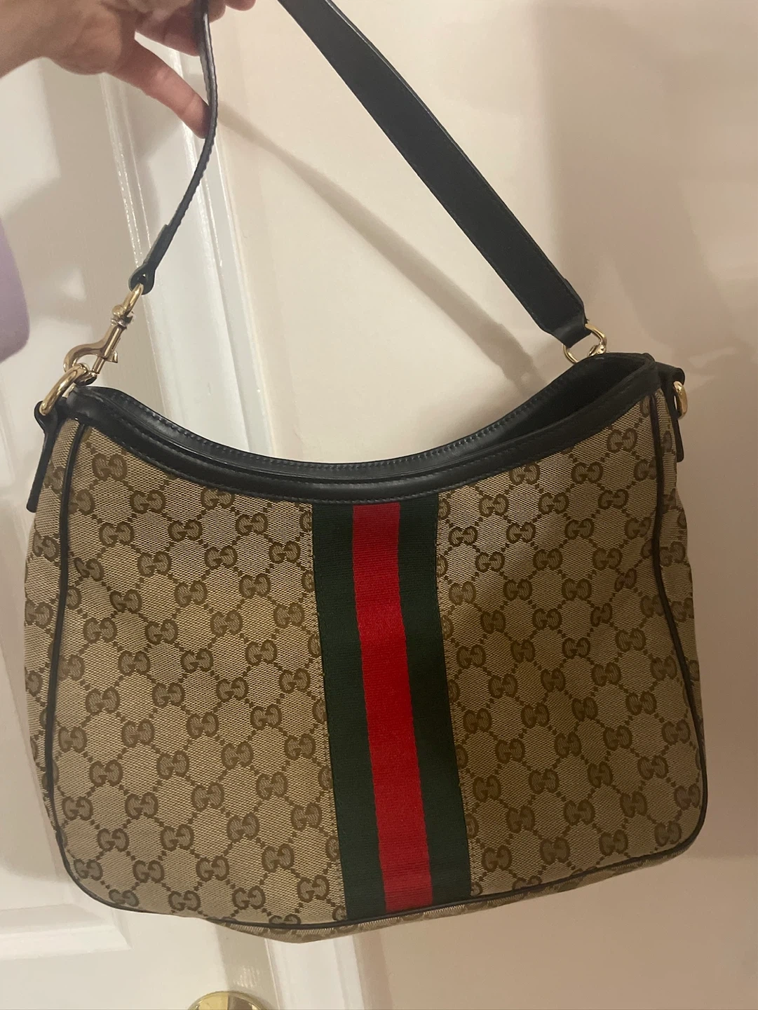 This Gucci hobo bag is crafted from signature canvas with the iconic red and green web stripe detail. It features a black leather trim and strap. Includes authenticity card.