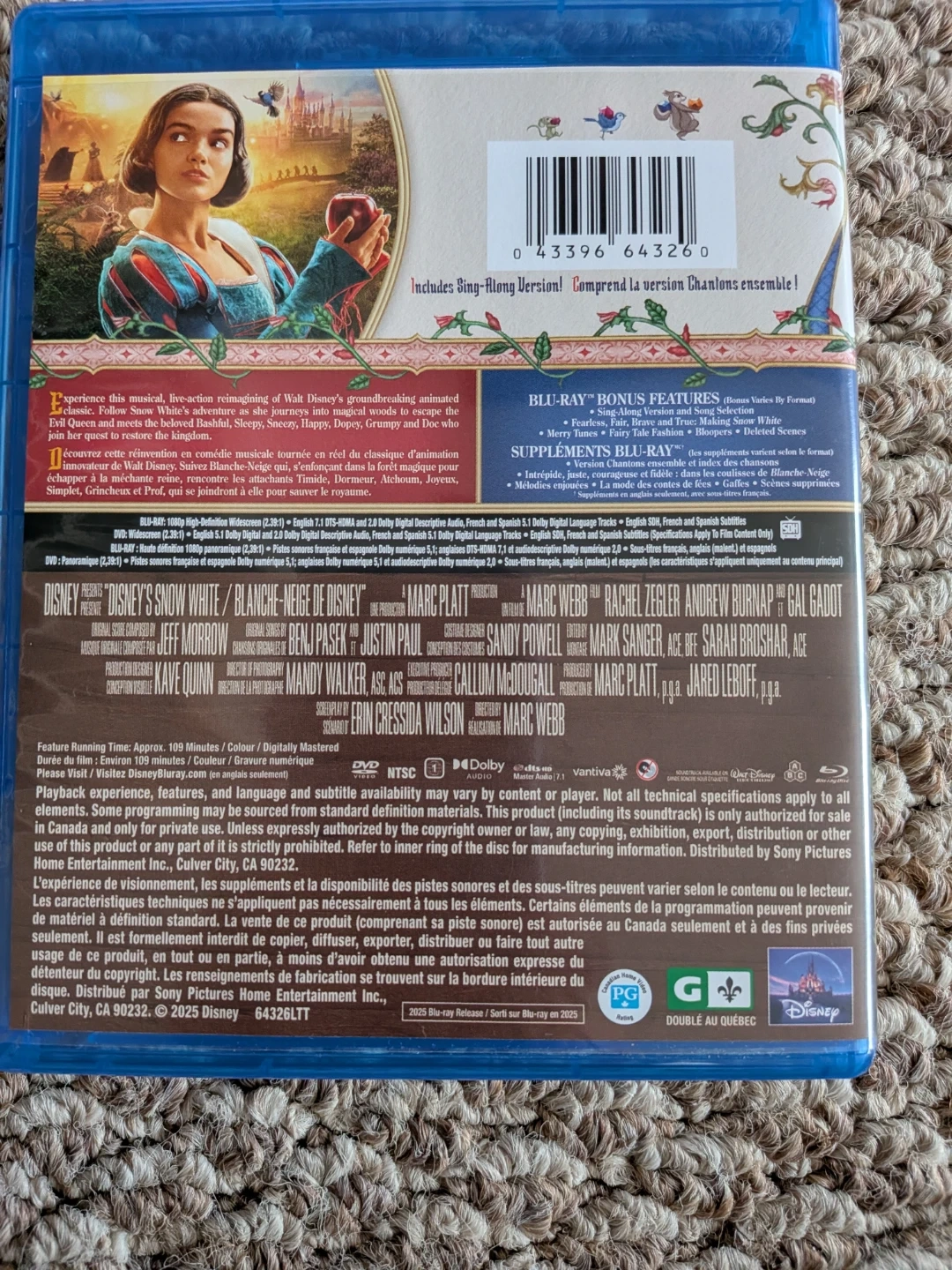 Blu-ray and DVD combo of Disney's Snow White! Enjoy this musical retelling of Walt Disney's classic animated film. Includes bonus features like sing-alongs and deleted scenes. A great addition to any Disney collection!