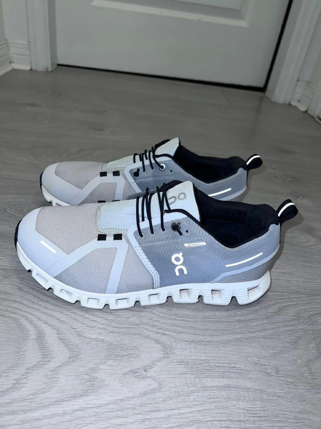 These On Cloud running shoes are a light grey colour. They feature the signature CloudTec cushioning. Size is US M8.5, EUR 42, UK 8. Waterproof
