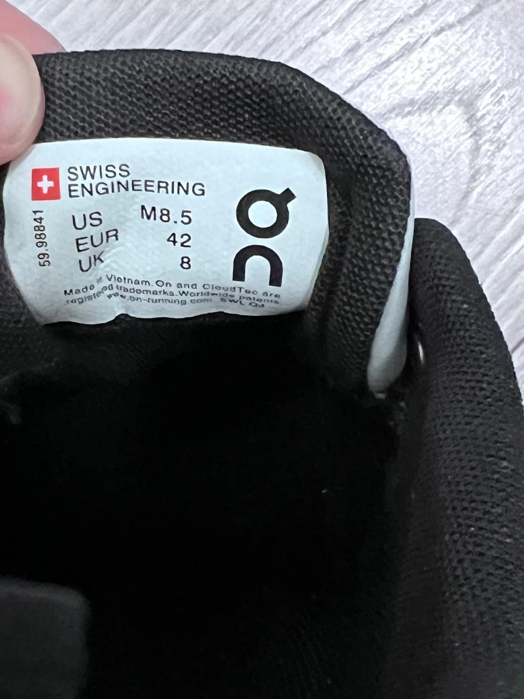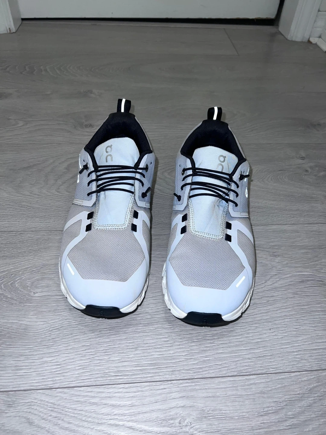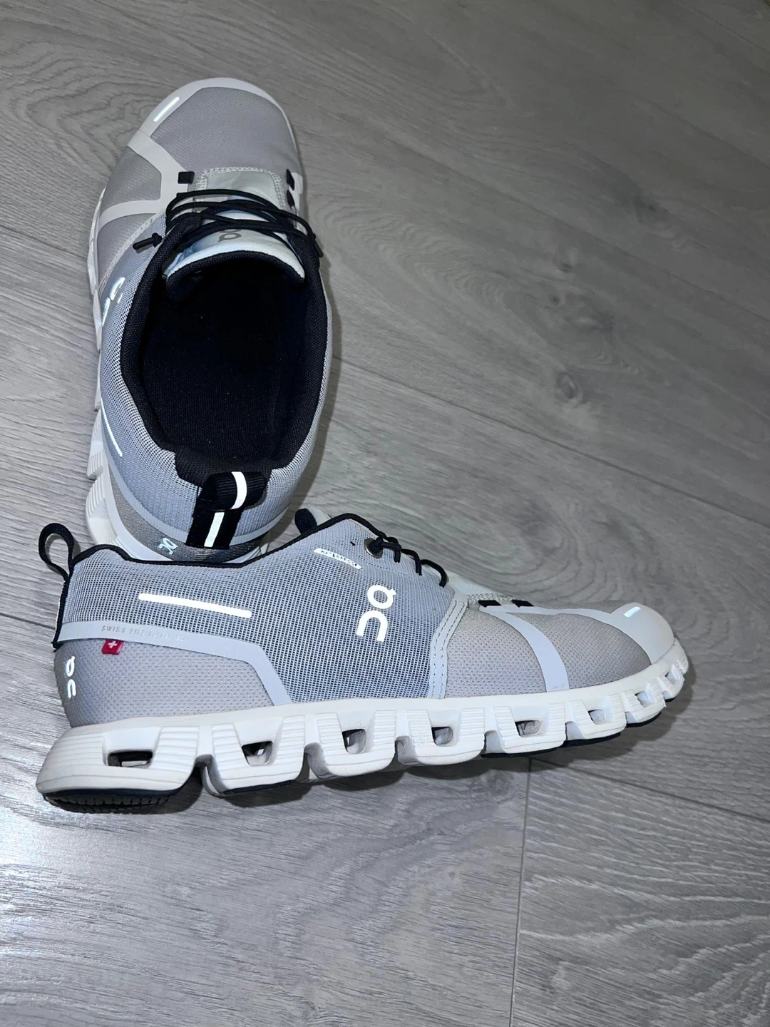 These On Cloud running shoes are a light grey colour. They feature the signature CloudTec cushioning. Size is US M8.5, EUR 42, UK 8. Waterproof