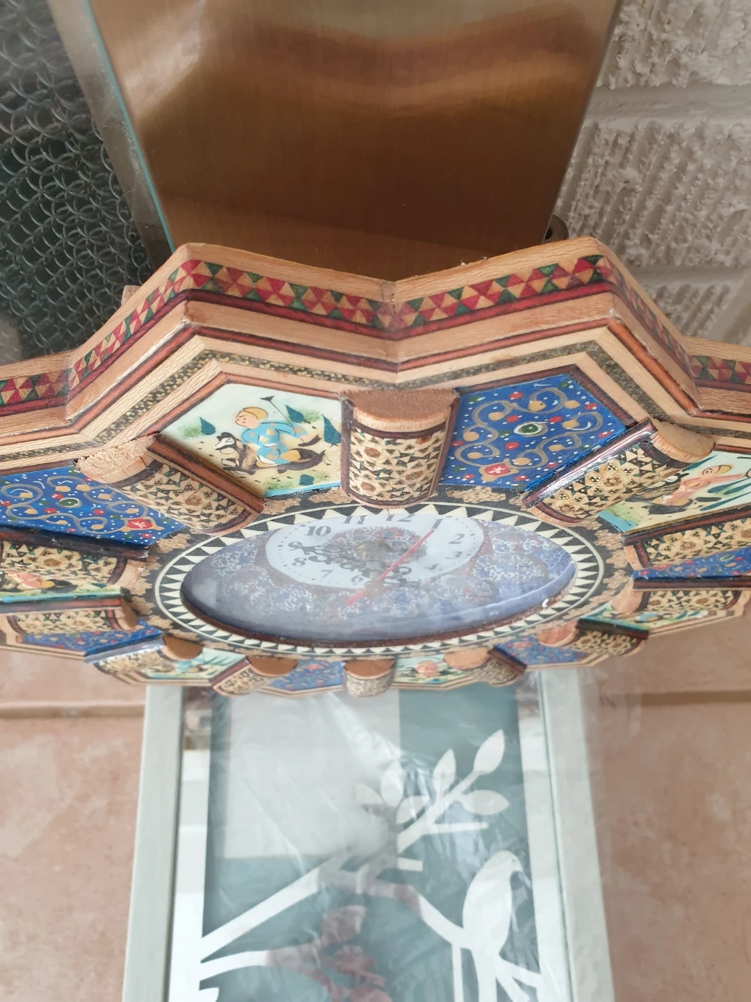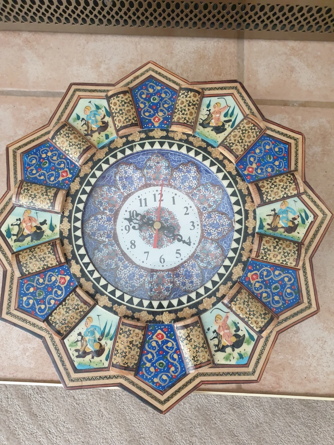This unique wall clock features intricate Persian-inspired art with detailed illustrations. It's a beautiful decorative piece for any room. Measures approximately 18 inches in diameter.