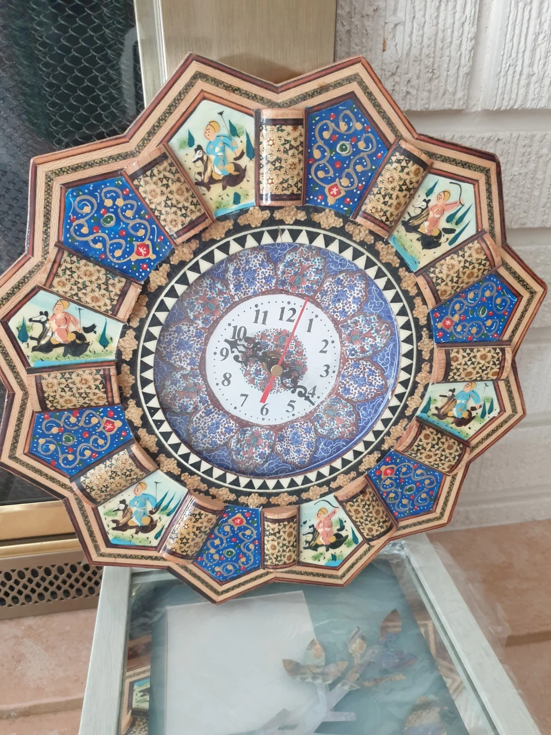 This unique wall clock features intricate Persian-inspired art with detailed illustrations. It's a beautiful decorative piece for any room. Measures approximately 18 inches in diameter.
