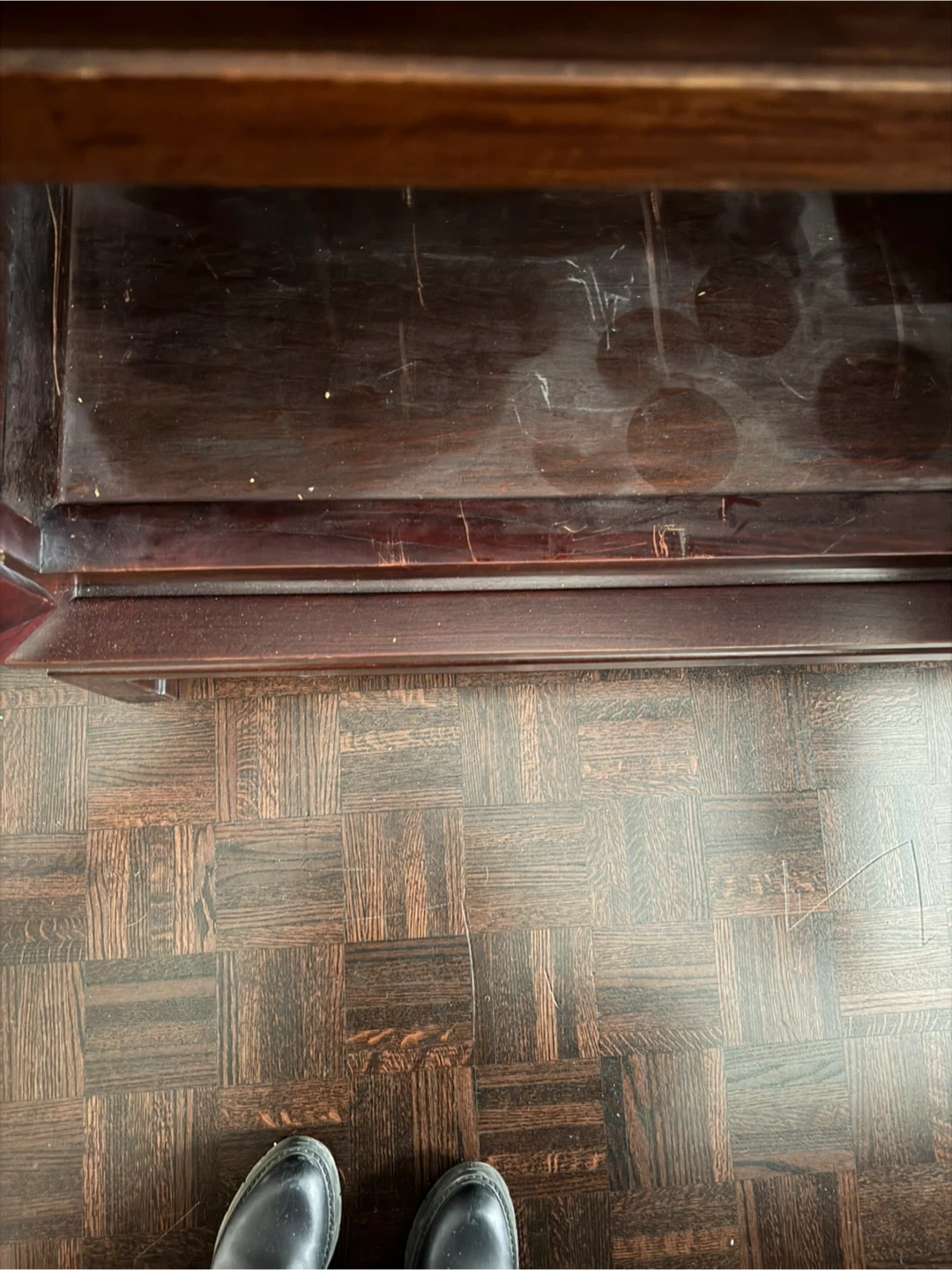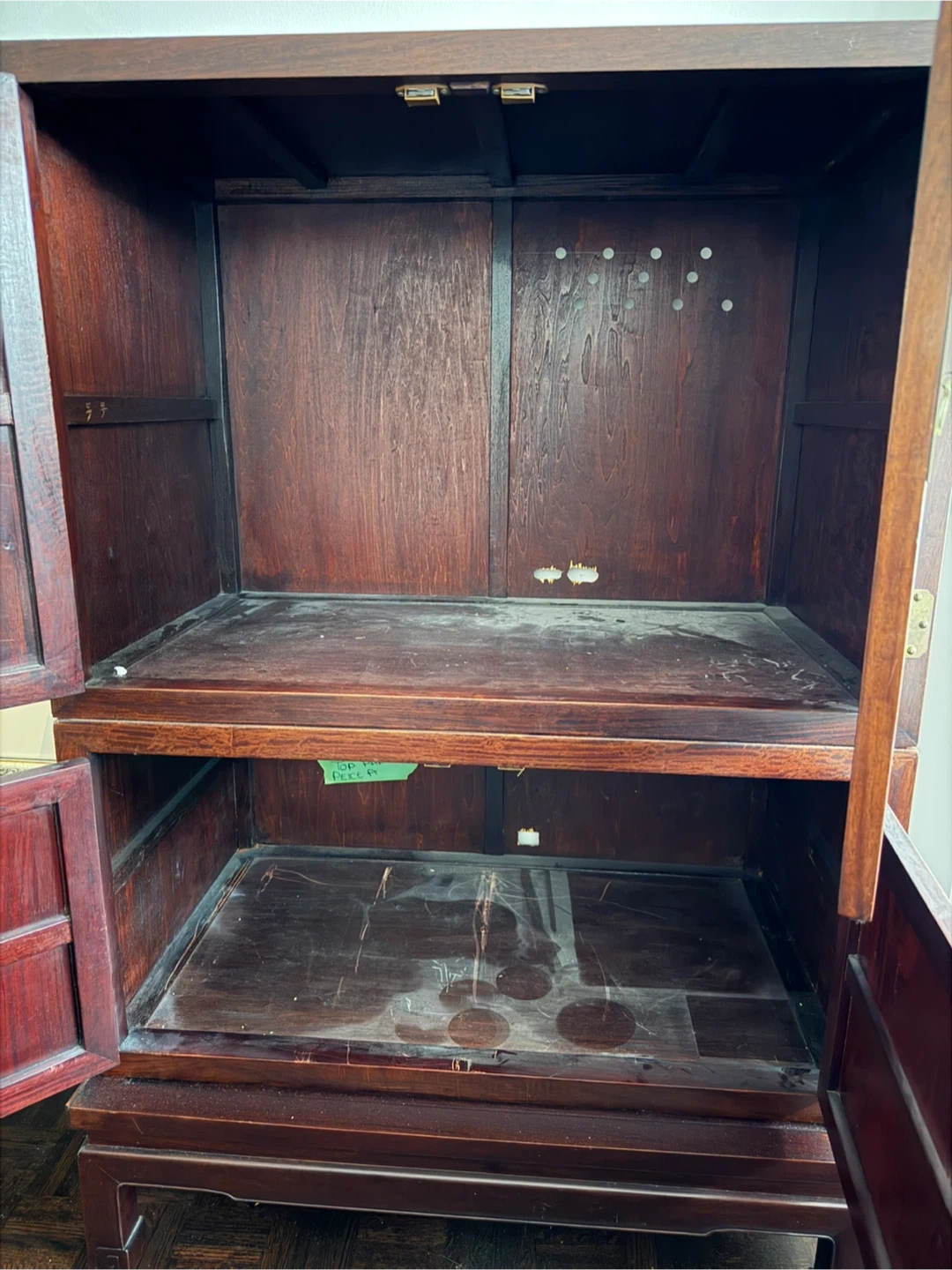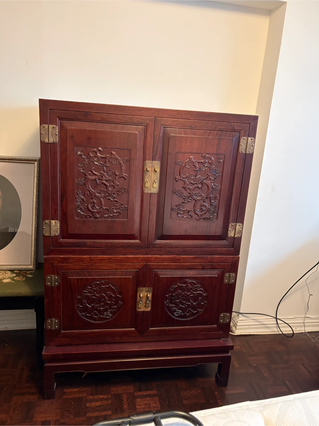 This antique wooden cabinet features intricate carvings and brass hardware. It has a dark wood finish and a classic design. This piece would be a lovely addition for someone looking for vintage decor.