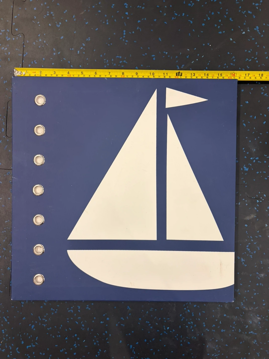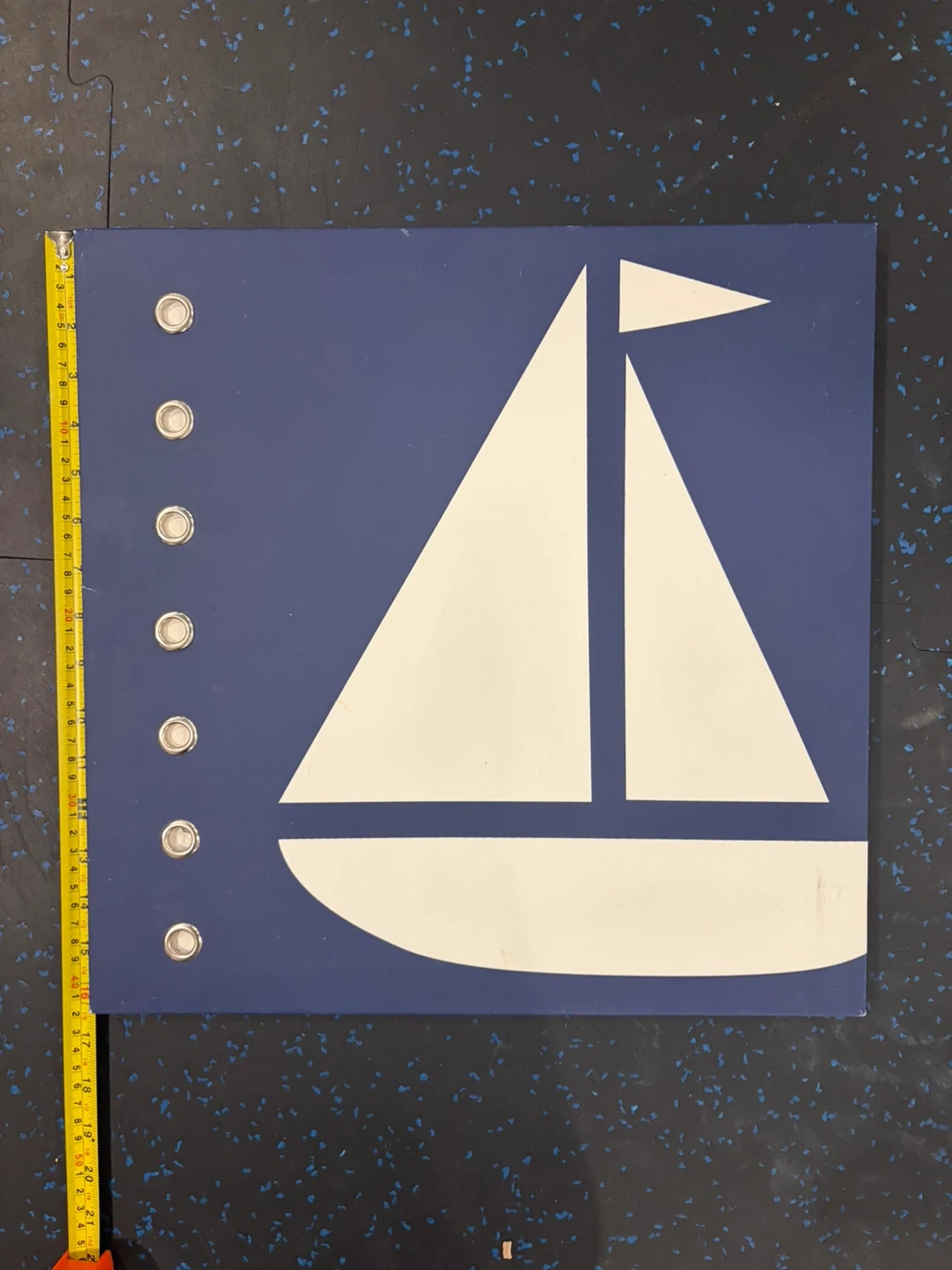 Decorative sailboat wall art on a blue background. It measures approximately 18 inches by 18 inches. Features a white sailboat design with a flag and grommets on the left side for hanging. Great for a nursery or kids' room! Puck up holly/derry milton
