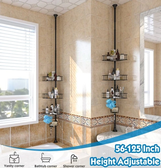 This new tension pole corner shower caddy features an oil-rubbed bronze finish and adjustable shelves, perfect for organizing your bath products. It fits neatly into any corner, providing convenient storage without taking up too much space.