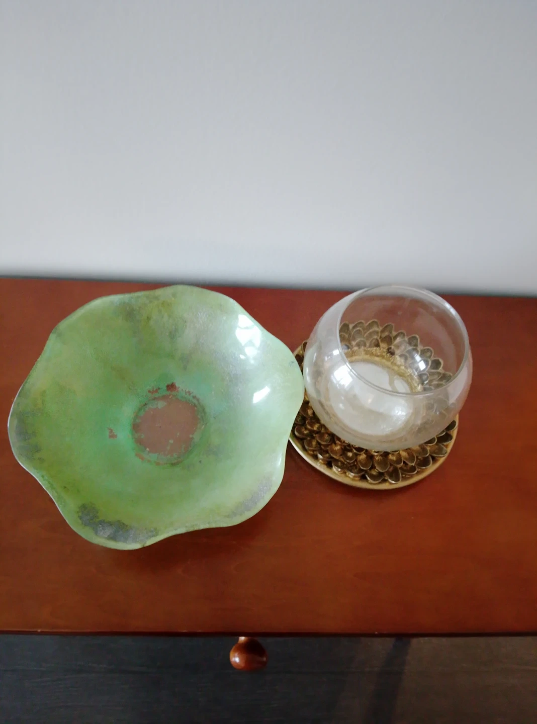 Selling a decorative green bowl and a candle holder. They add a touch of elegance to any room. The bowl has a unique, organic shape, and the candle holder features a delicate gold design. Perfect for creating a cozy atmosphere!
