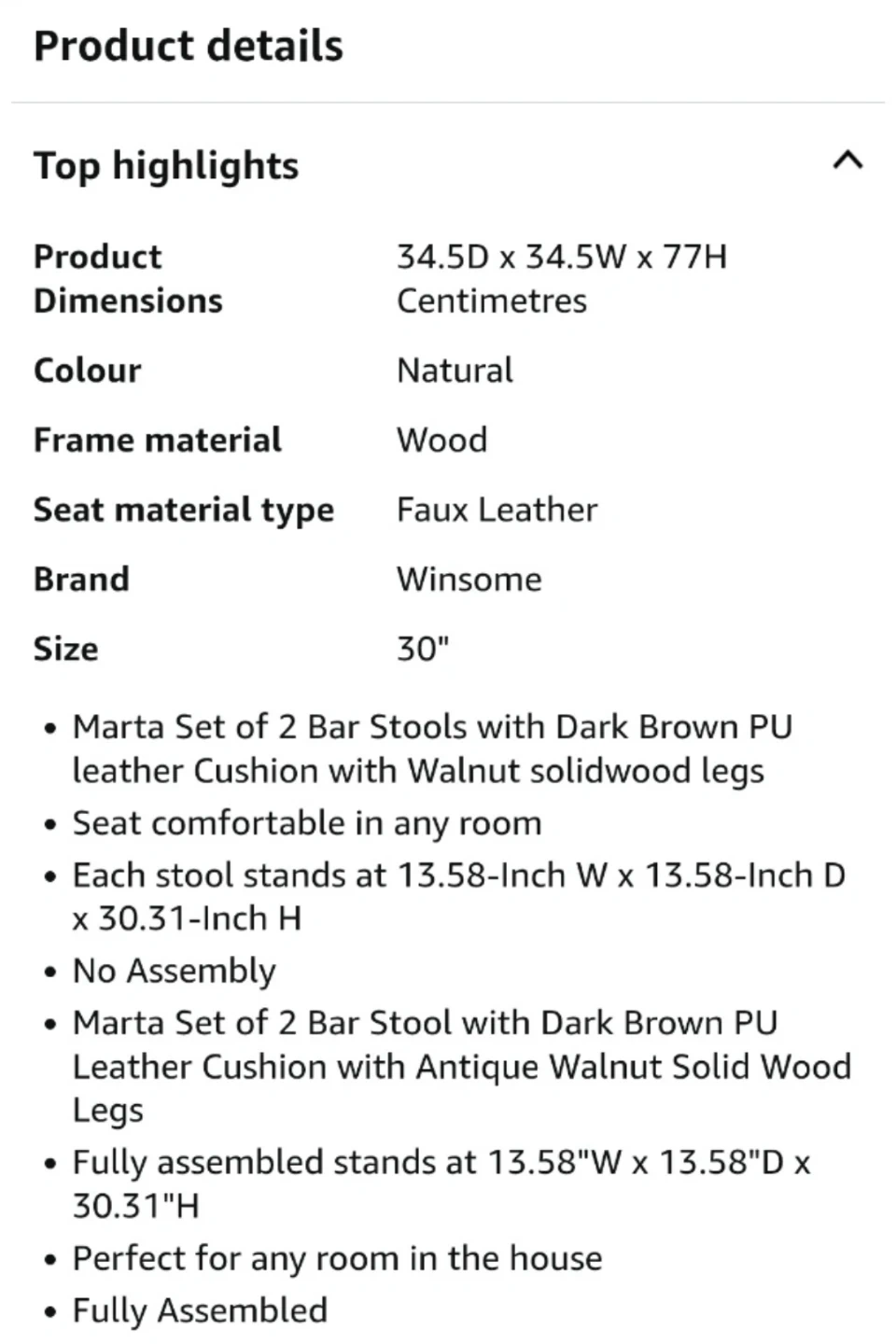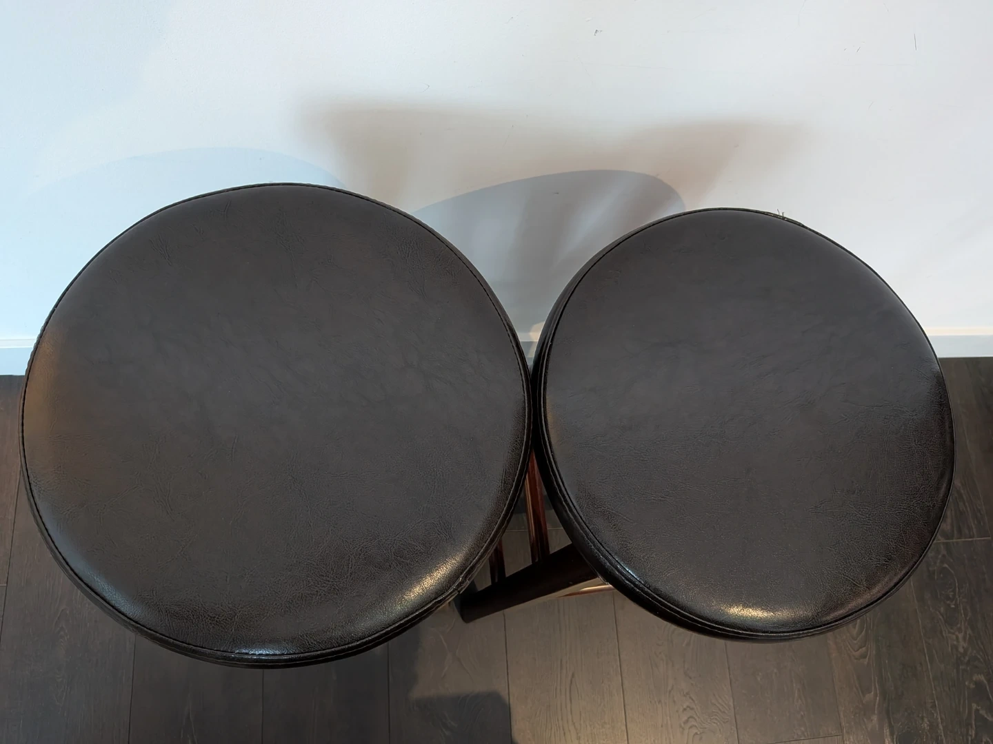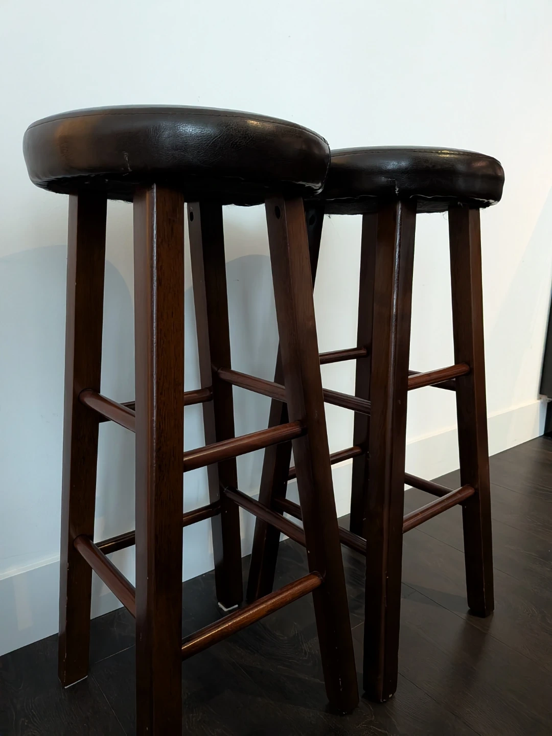 These are a set of two dark brown bar stools with faux leather tops and wooden legs. They're comfortable for sitting at a counter or bar. A small tear is present on the edge of stool seat.