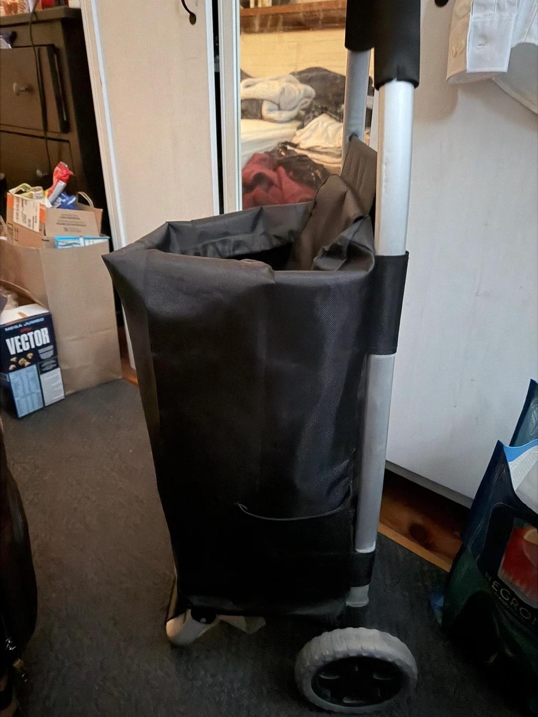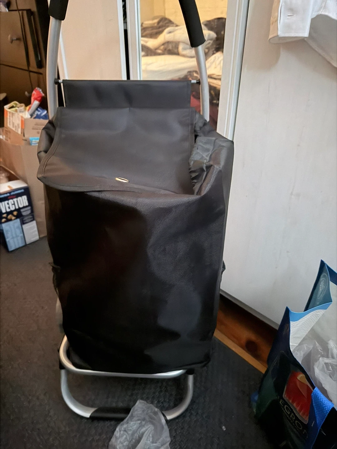 This is a black shopping trolley bag with a Aluminum frame and rubber wheels. It's designed for carrying groceries and other items. The bag is made of durable fabric and offers a good amount of storage space. It's great for running errands or trips to the market!