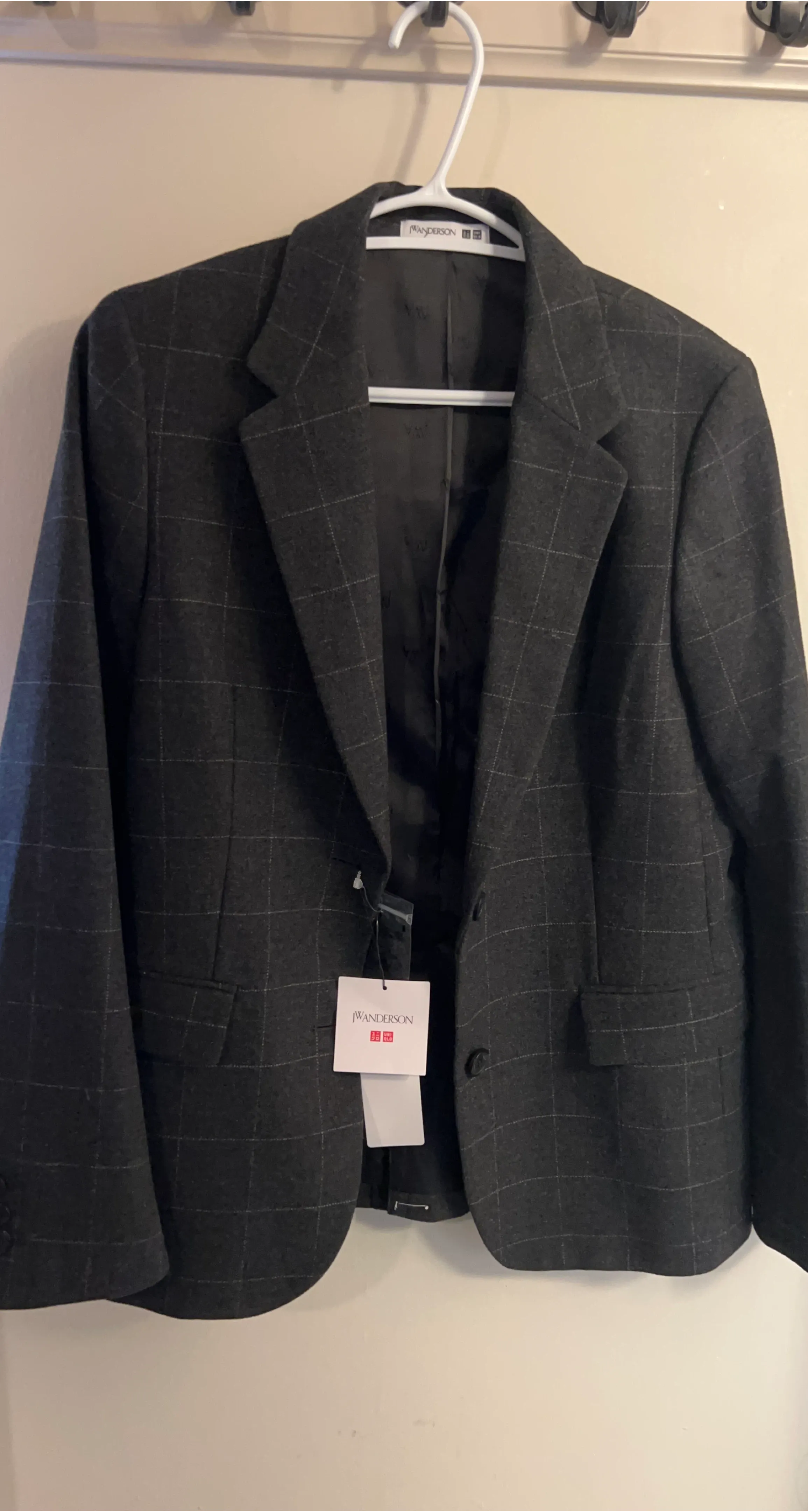 Dark grey blazer with a subtle plaid pattern. It's from the J.W. Anderson collaboration with Uniqlo. Features two front pockets and a classic two-button closure. Material blend adds a nice texture.