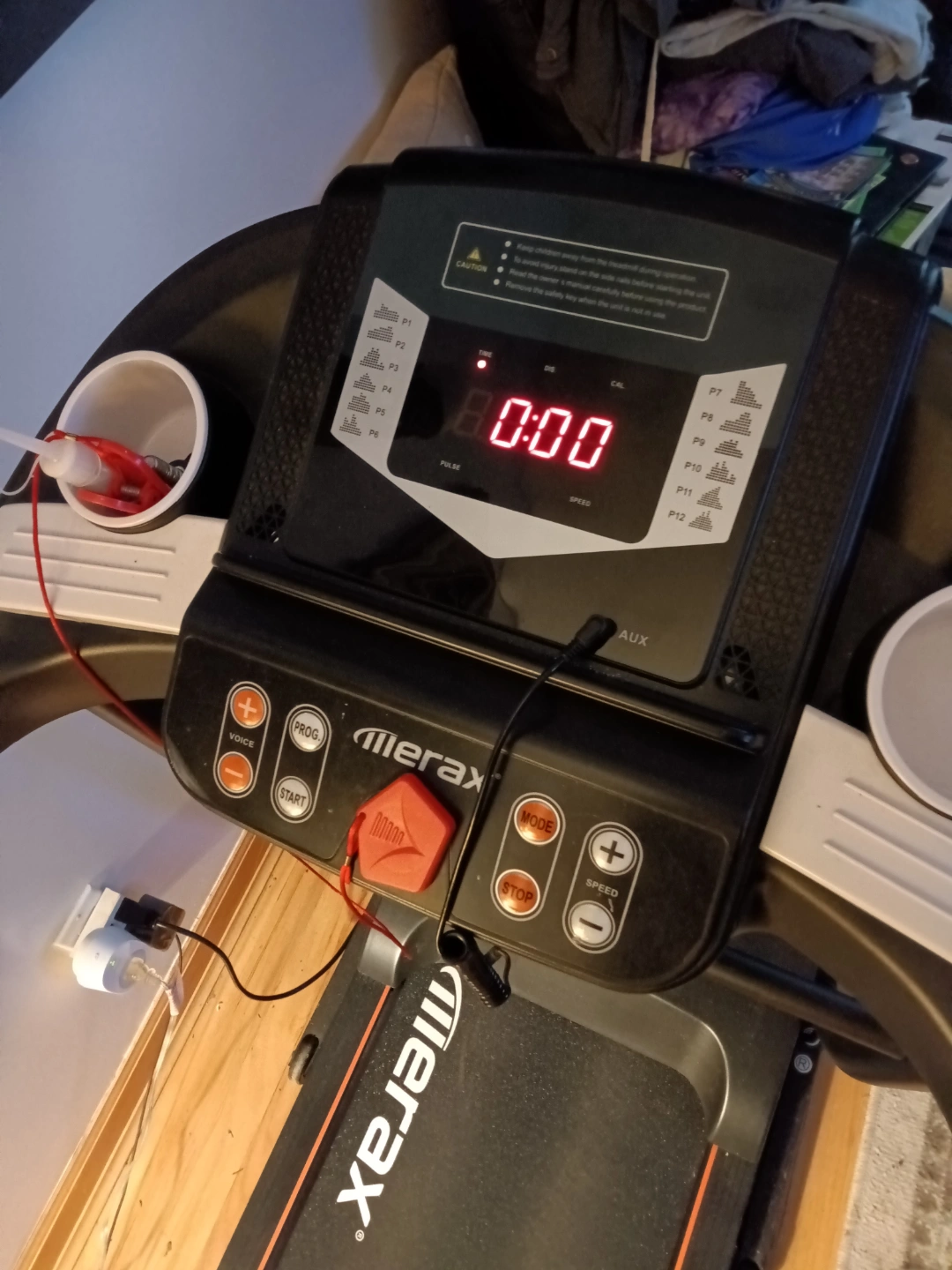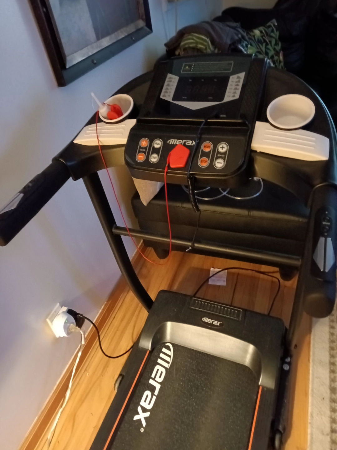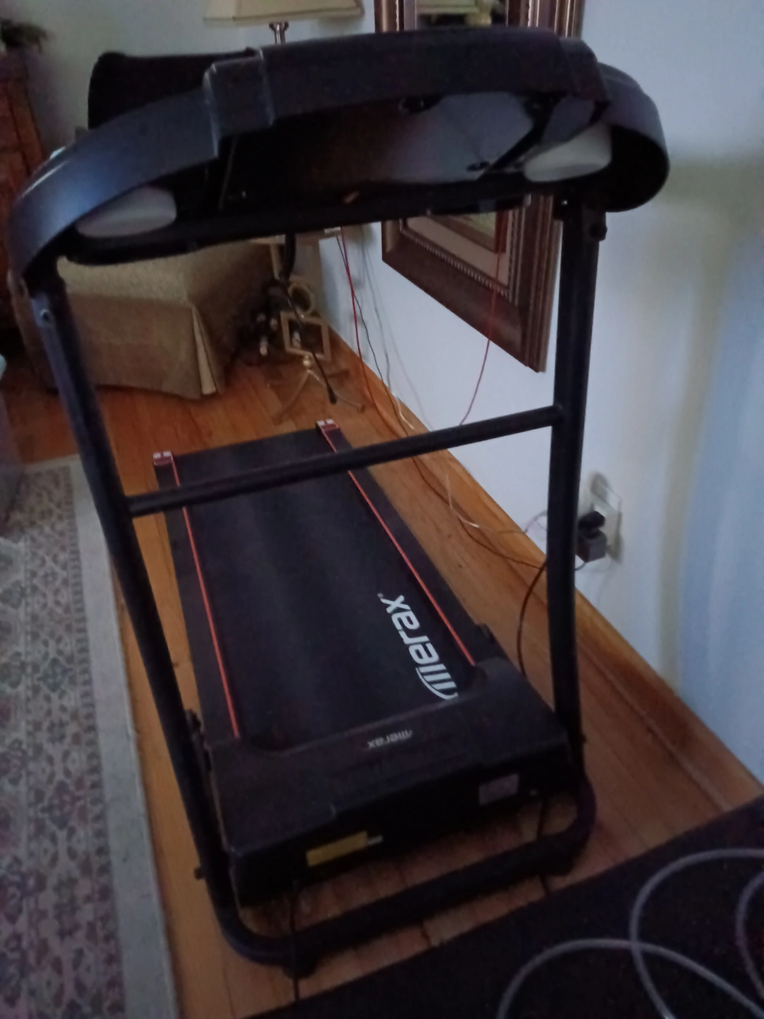 Electric treadmill in very good condition, some minor wear. Includes console, handrails, safety clip and running belt. Small, portable design. Merax Folding Electric Treadmill, a compact fitness machine designed for home use.