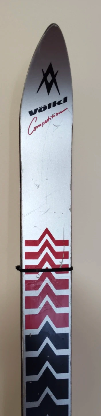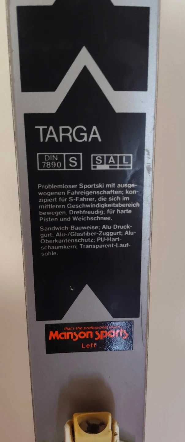Volkl Targa Competition skis with Tyrolia 390 bindings. These skis are a size S and are designed for easy skiing for S-skiers. They're constructed with a sandwich-sidewall construction for performance on hard and icy snow.