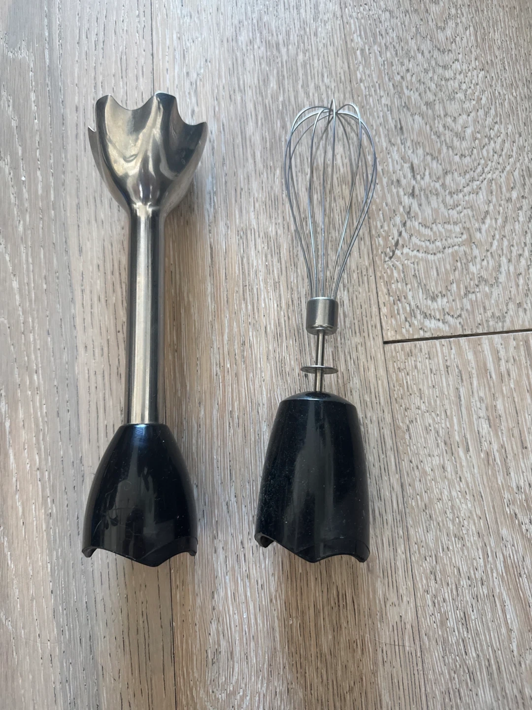 Includes a stainless steel whisk attachment and a blending wand attachment with a black base. These are accessories for an immersion blender. Use them for mixing batters or pureeing small amounts.
