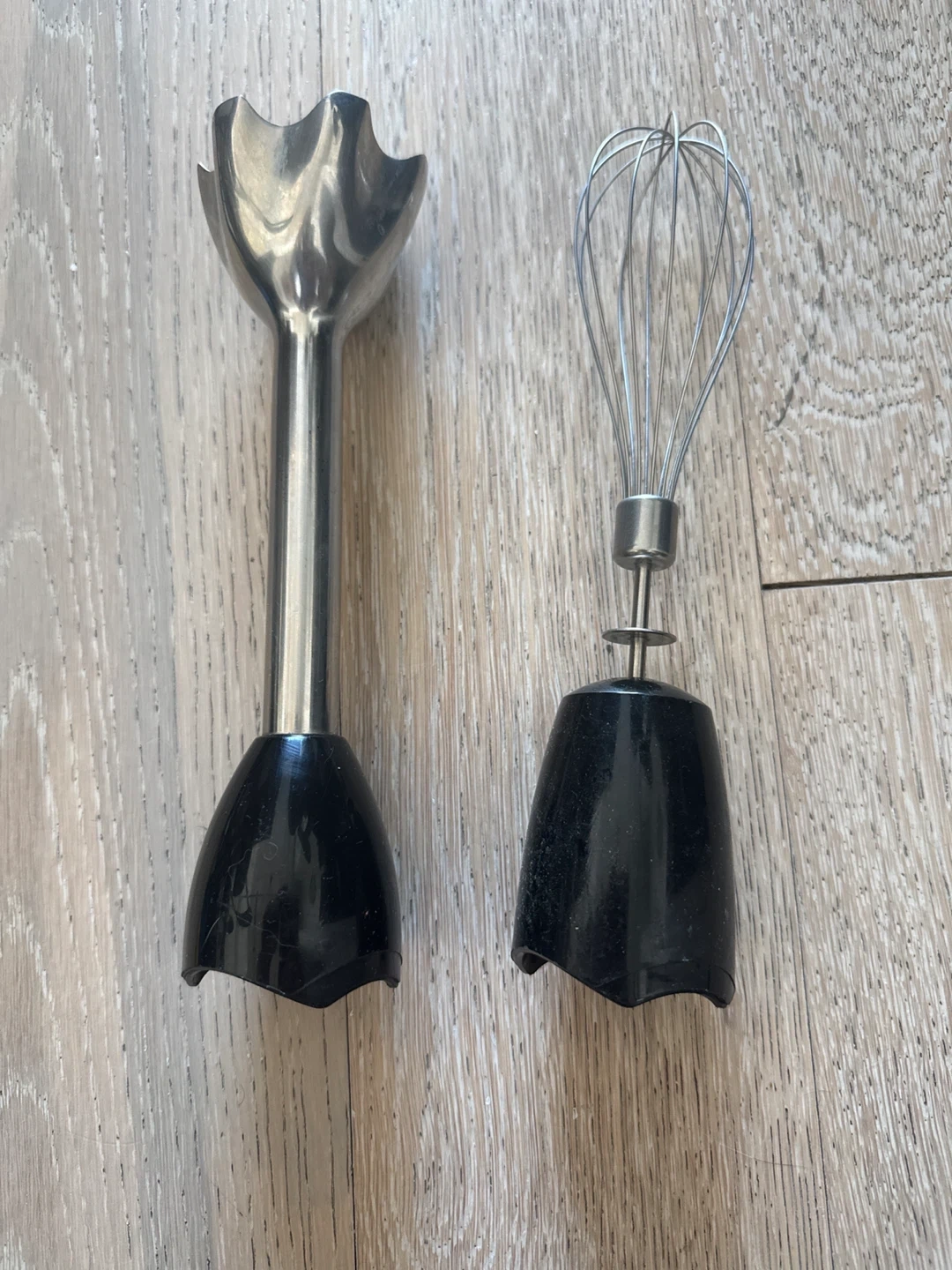 Includes a stainless steel whisk attachment and a blending wand attachment with a black base. These are accessories for an immersion blender. Use them for mixing batters or pureeing small amounts.