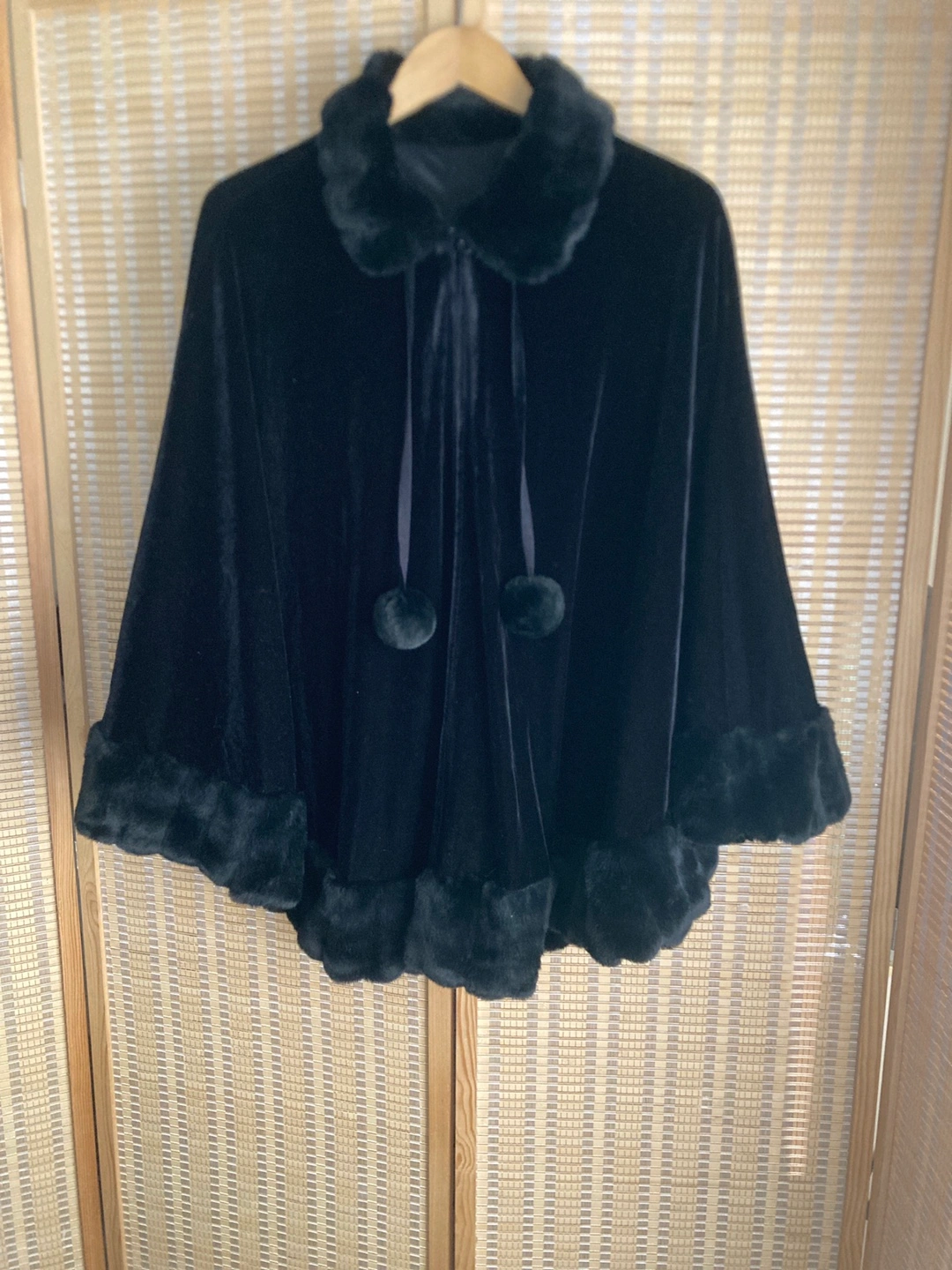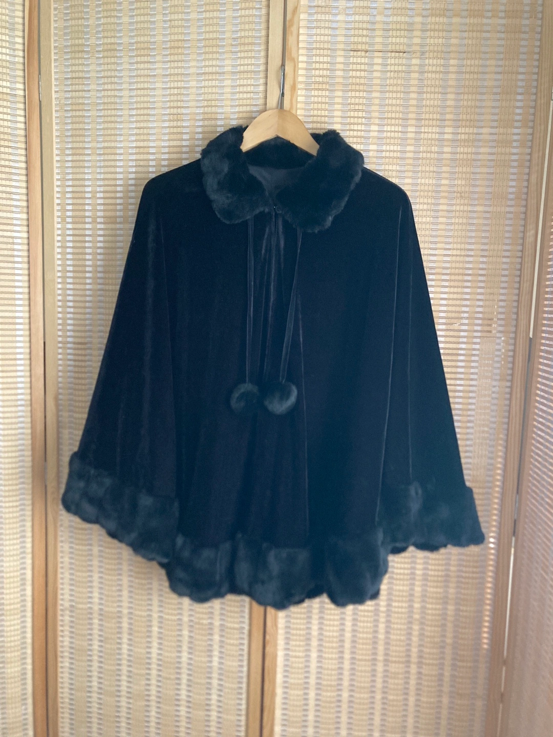 Selling a beautiful black velvet cape! It features a fluffy, elegant faux fur trim around the collar and hem. In great condition and perfect for layering over a cute/feminine outfit