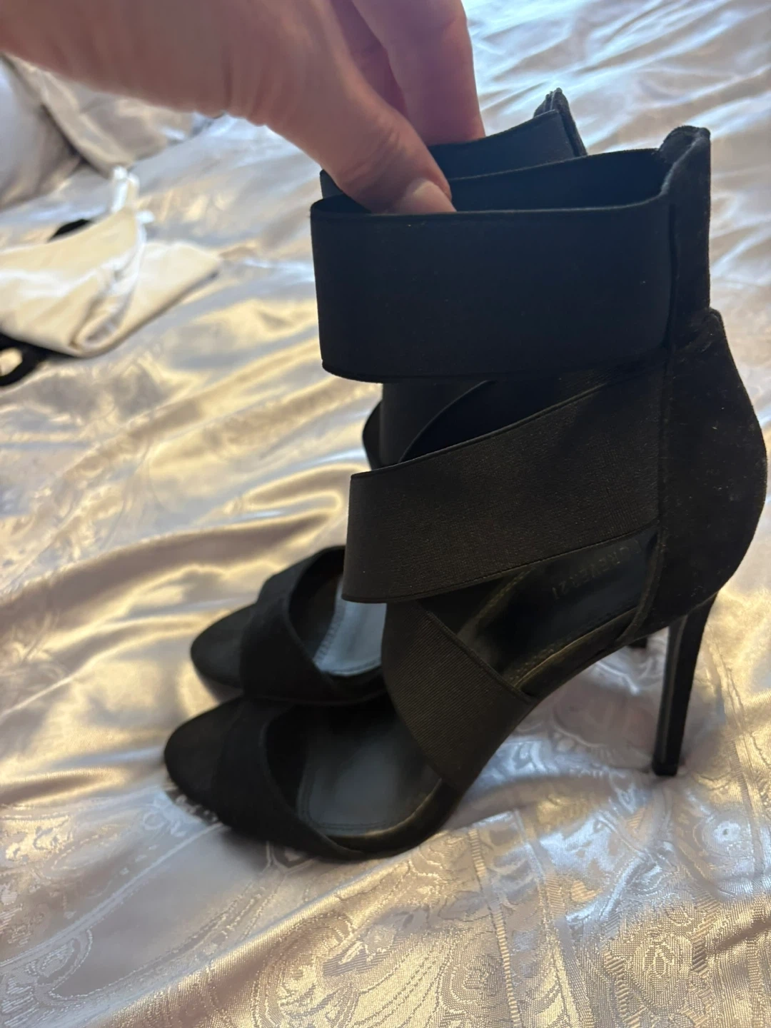 These black heels feature stylish elastic straps that wrap around the ankle and leg. The material looks like a soft suede with fabric straps. They have a pointed toe and a stiletto heel.