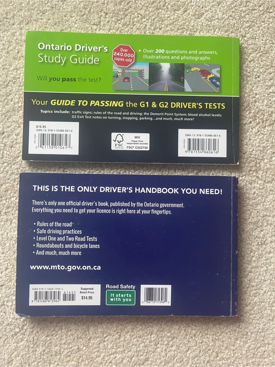 These books are your guides to passing the G1 and G2 driver's tests in Ontario. They cover traffic signs, rules of the road, and driving practices. The Study Guide includes over 200 sample test questions and answers. The Official Handbook is published by the Ontario government.