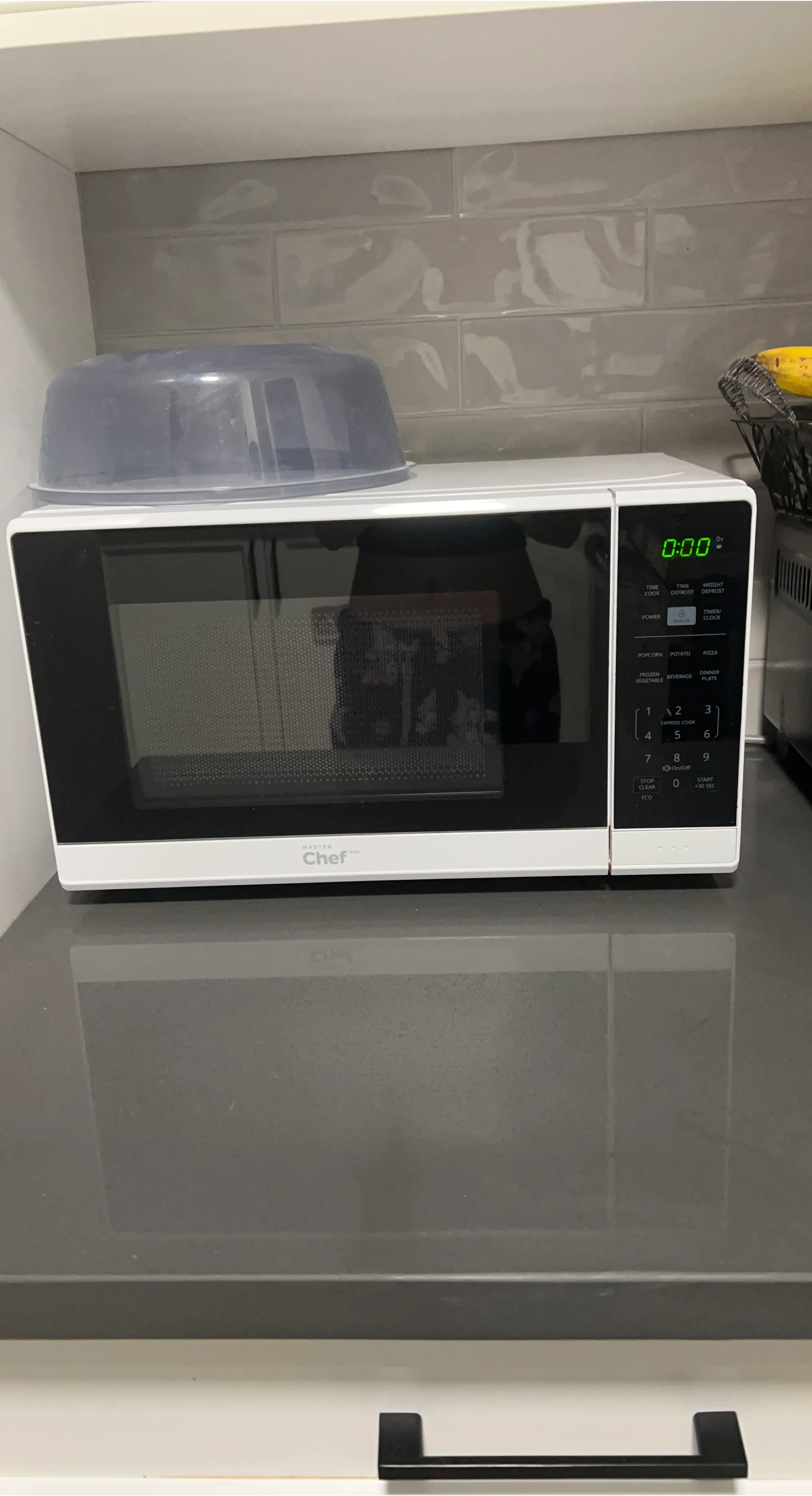 This is a white Master Chef microwave oven. It has express cook buttons and a start +30 sec option. It's great for quick reheating and simple meal prep!