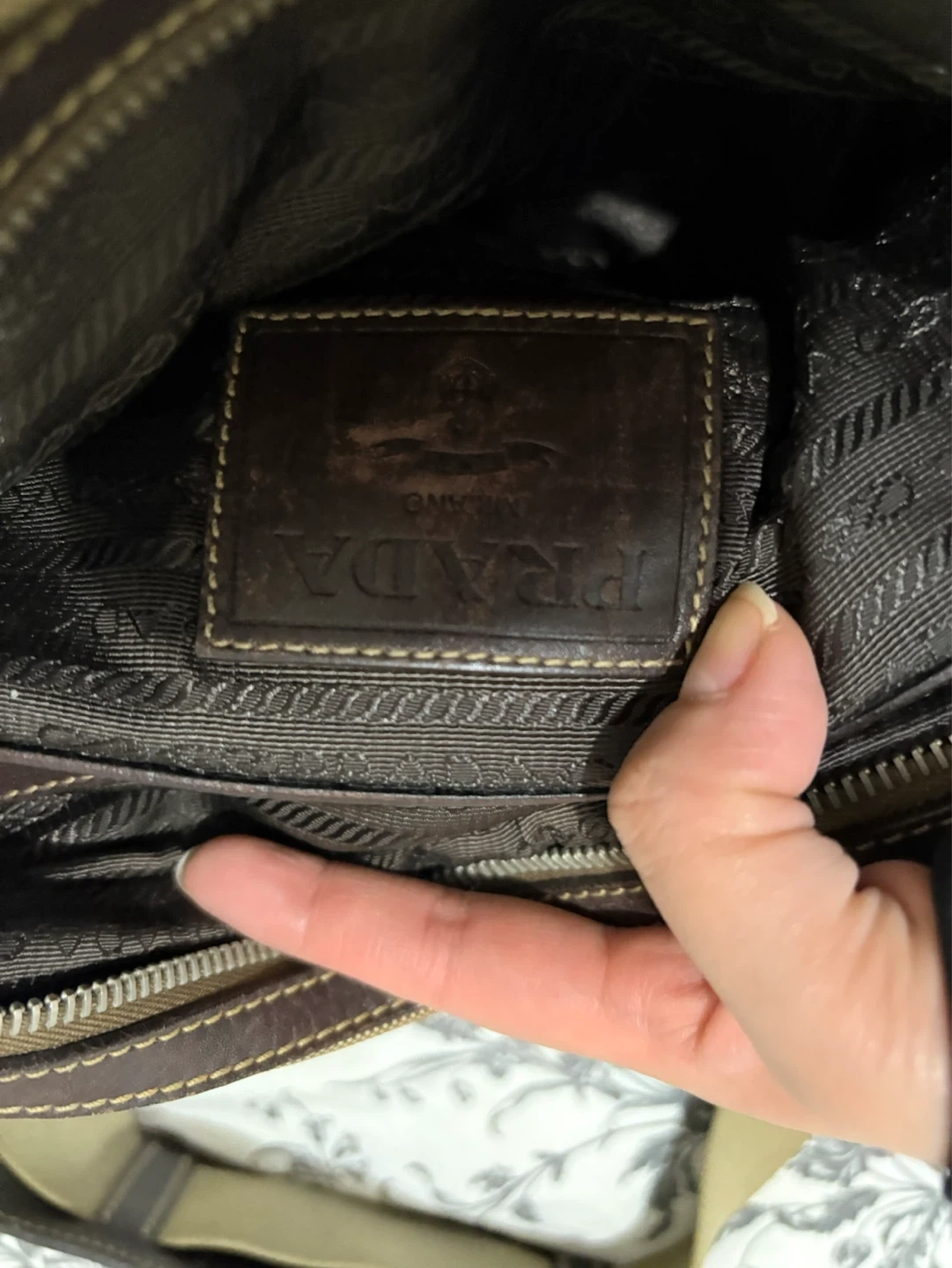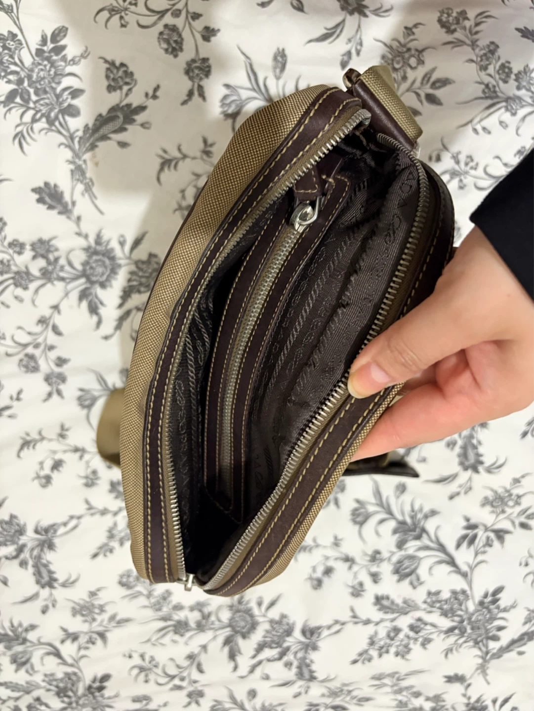 Prada Logo Jacquard Shoulder Bag (often model VA0644. This is a Prada messenger bag with leather accents. It features the Prada logo and "Milano" detailing. The adjustable strap makes it comfortable for everyday wear.