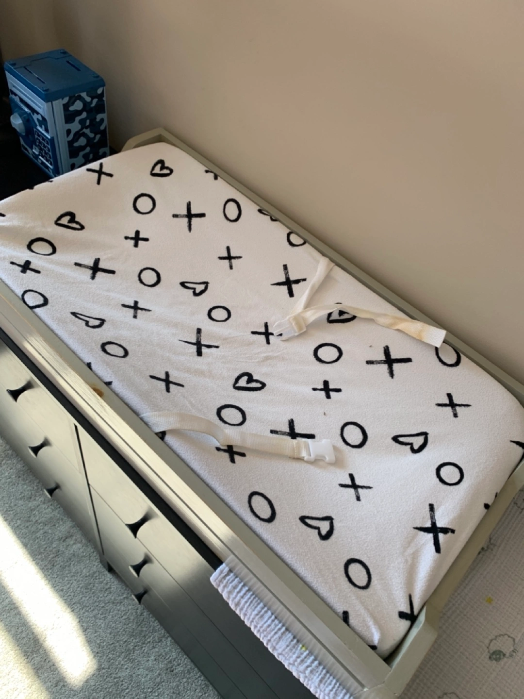 Changing station with changing pad that has straps. A neutral design. A gentle and safe place to change your little one, bringing peace to you both.