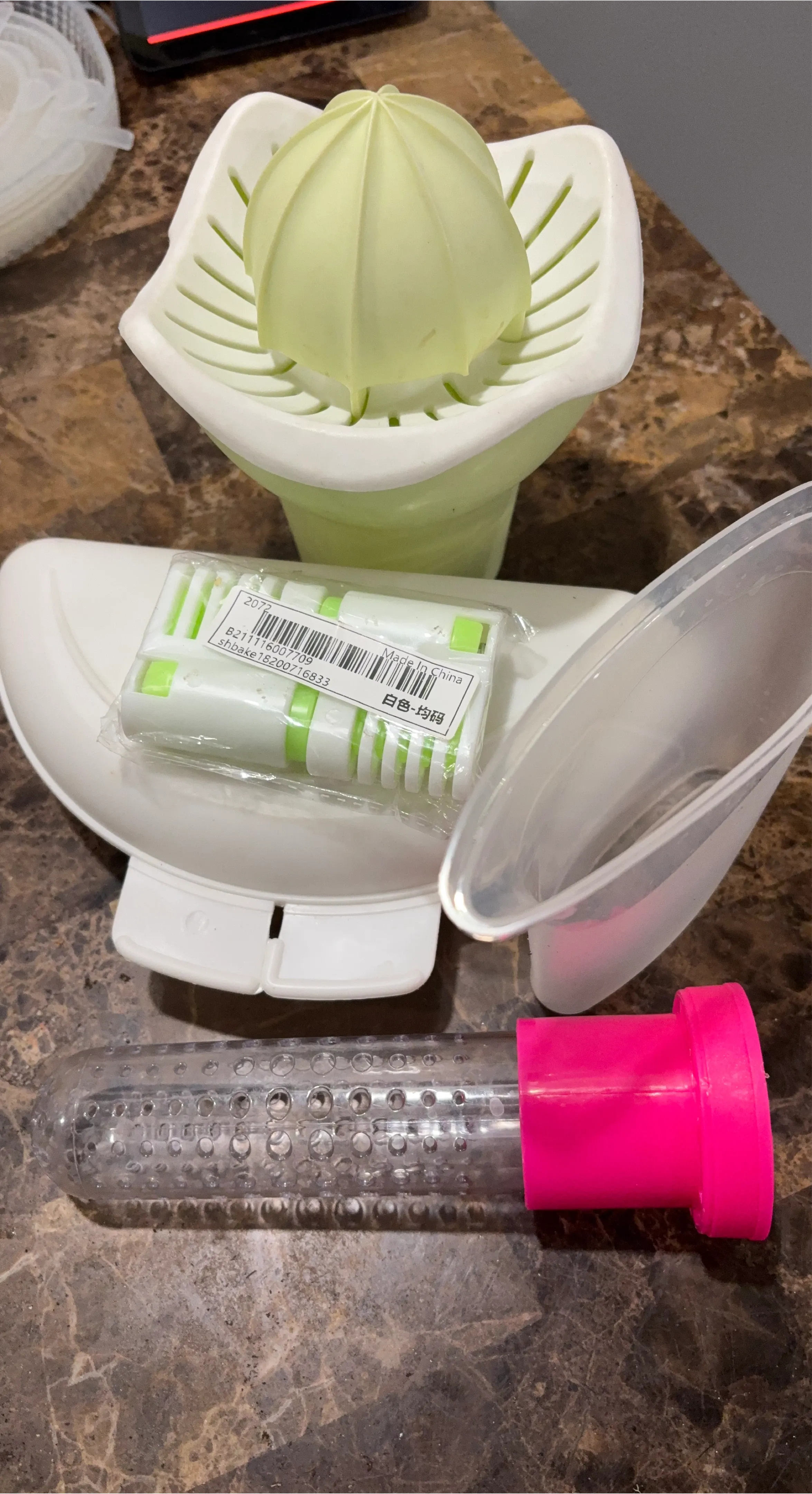 This set includes a manual citrus juicer and a fruit infuser water bottle. The bottle features a clear body with a pink cap and has a perforated inner tube for fruit. It's great for making fresh juice and infused water!