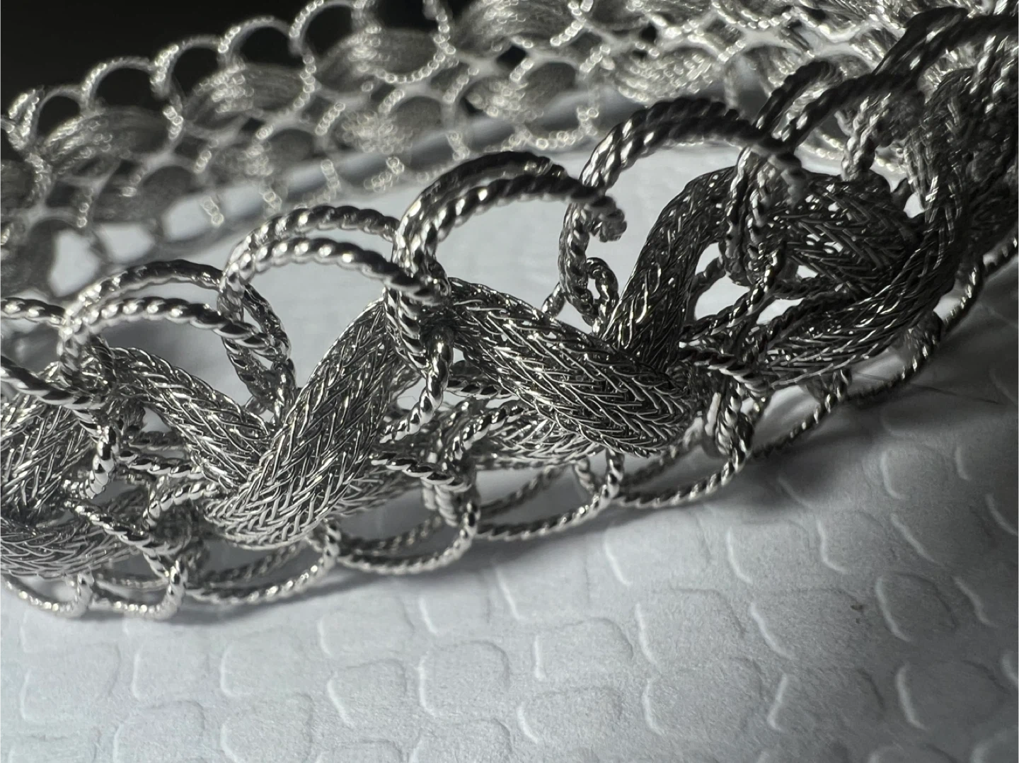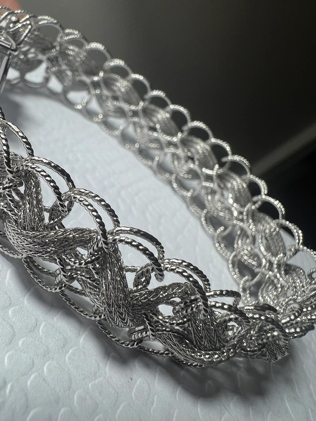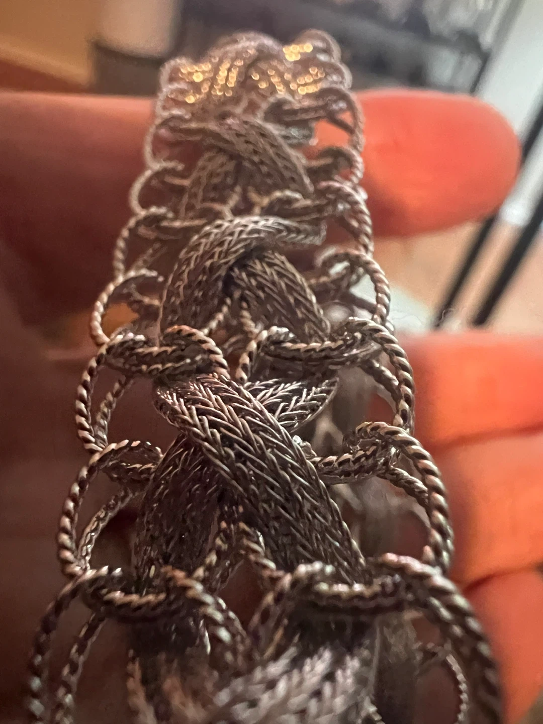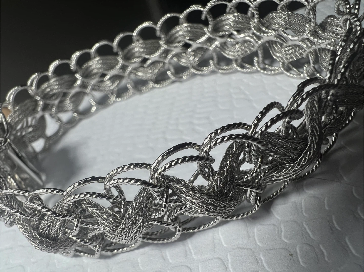 Sterling silver bracelet with a complex woven design. It features a unique combination of chain links and braided textures for a sophisticated look. This piece would make a great accessory for any outfit!