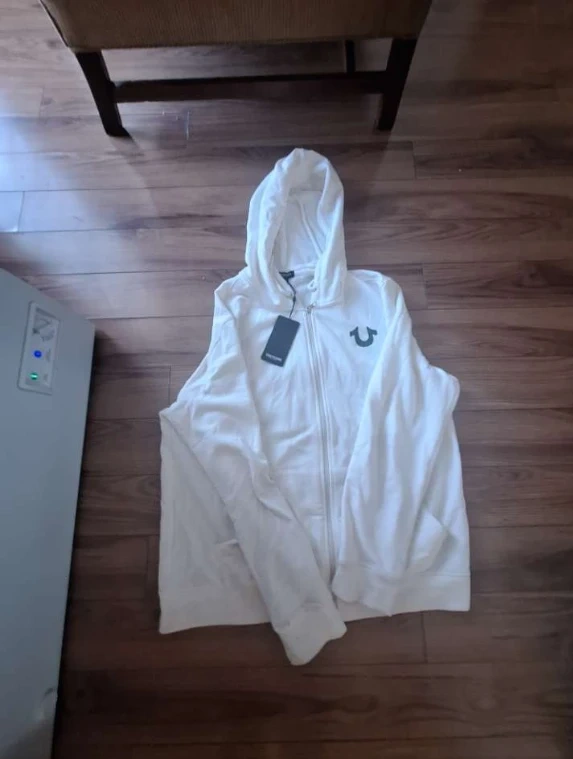 This is a white zip-up hoodie from True Religion. It's made of cotton and features the brand's signature horseshoe logo on the chest. This hoodie is perfect for casual wear. It has a full zip closure and a hood.