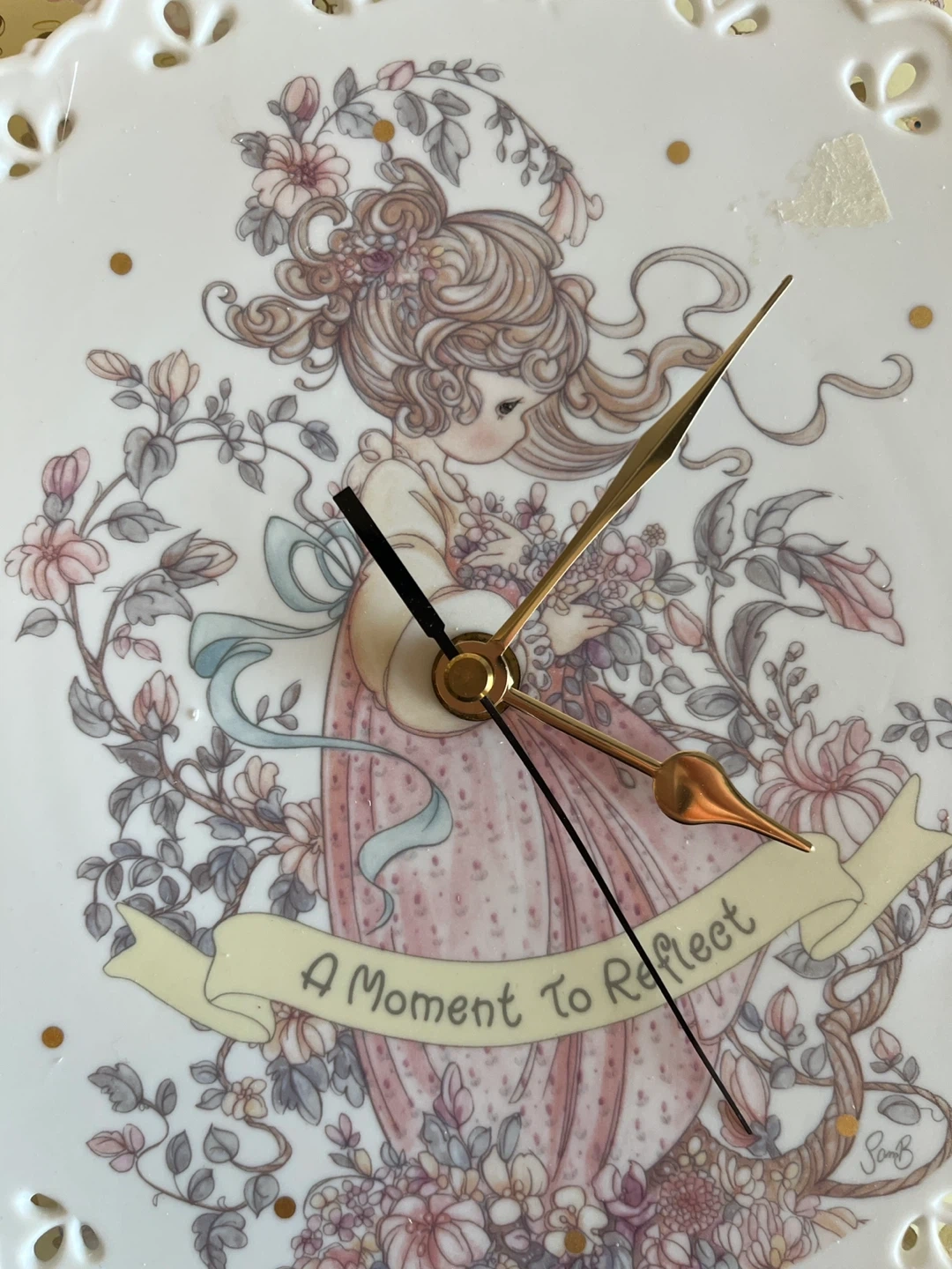 This is a Precious Moments "A Moment to Reflect" wall clock. It has a decorative scalloped edge and gold-tone hands. Brand new in box.
