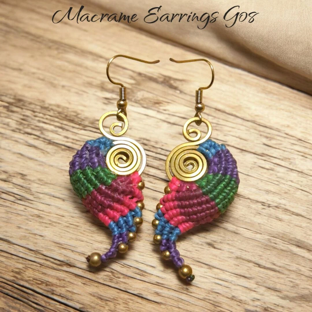 Handmade macrame earrings with a colourful feather design. Features gold-tone hooks and spiral accents. Great for adding a bohemian touch to any outfit!