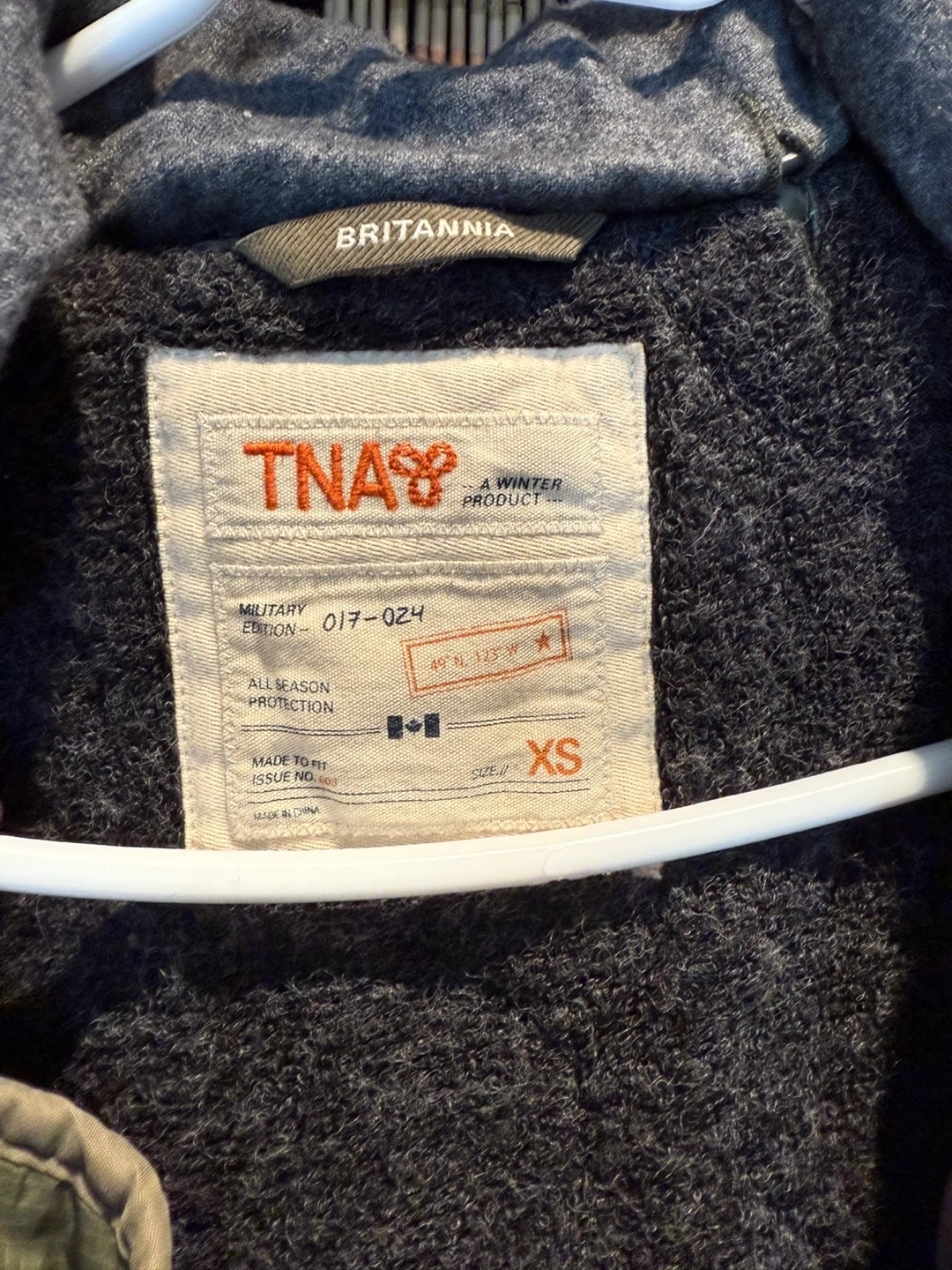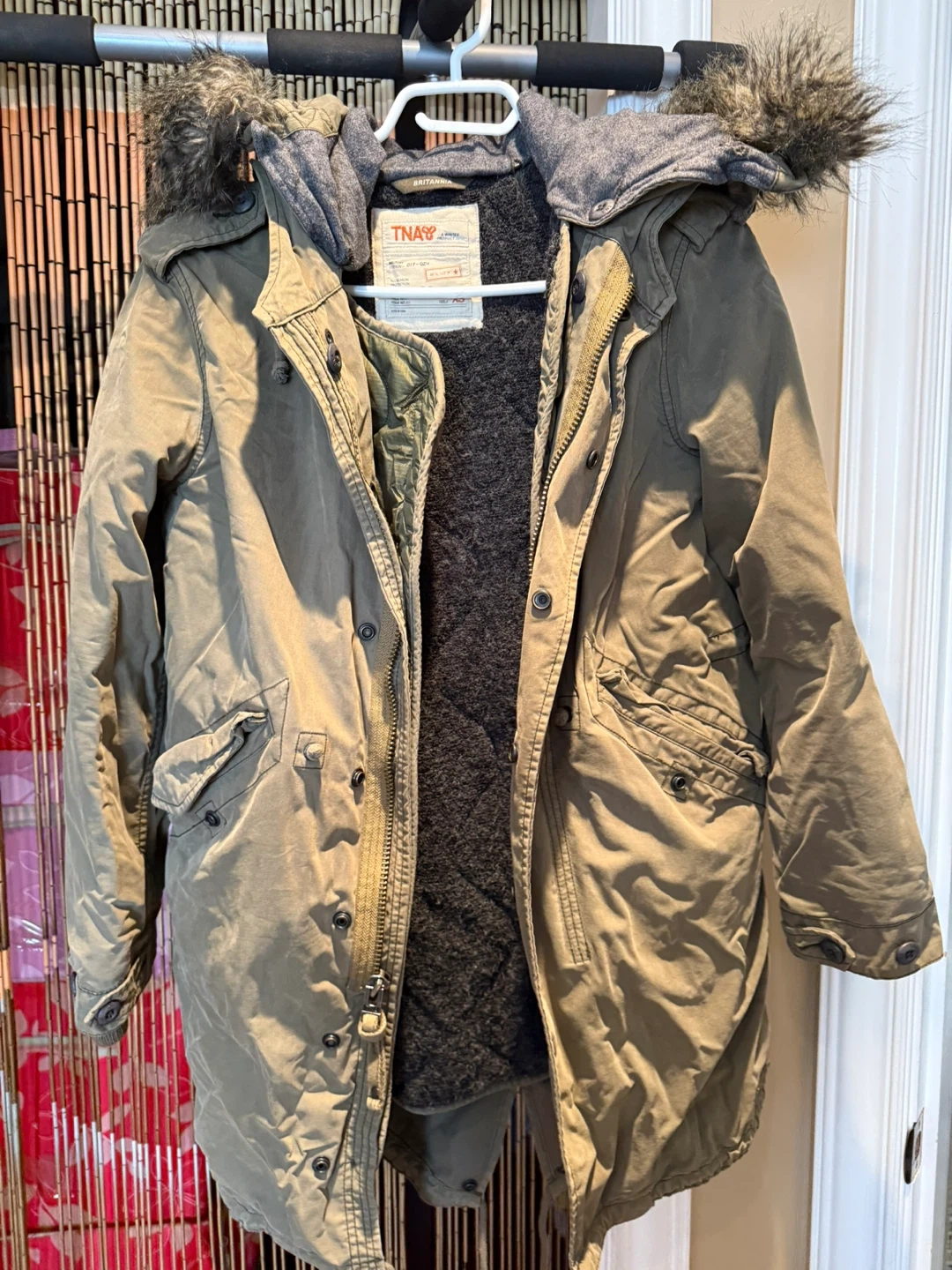 Selling a TNA Britannia winter parka in size XS. It's in great condition and perfect for the cold weather! The parka has a fur-trimmed hood and a warm, quilted lining to keep you cozy all winter long