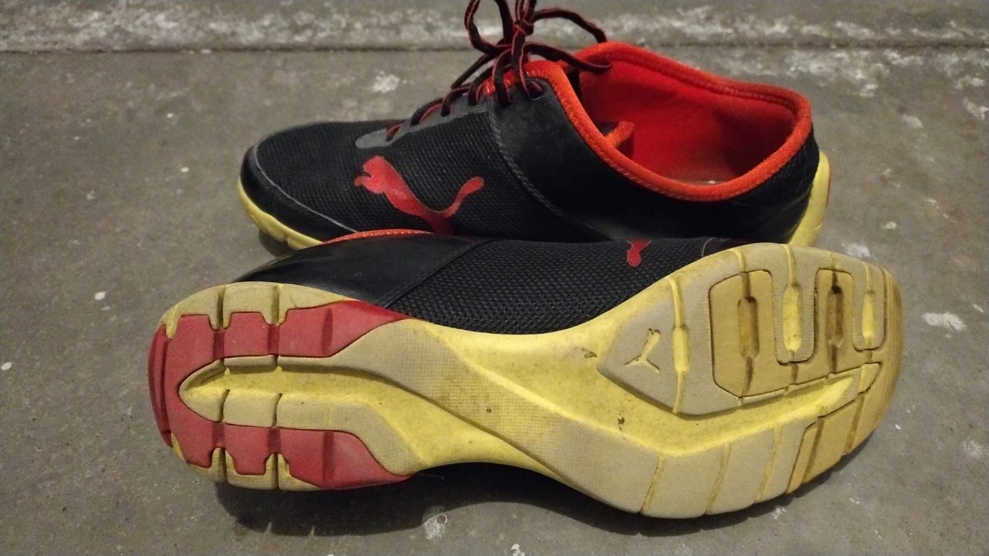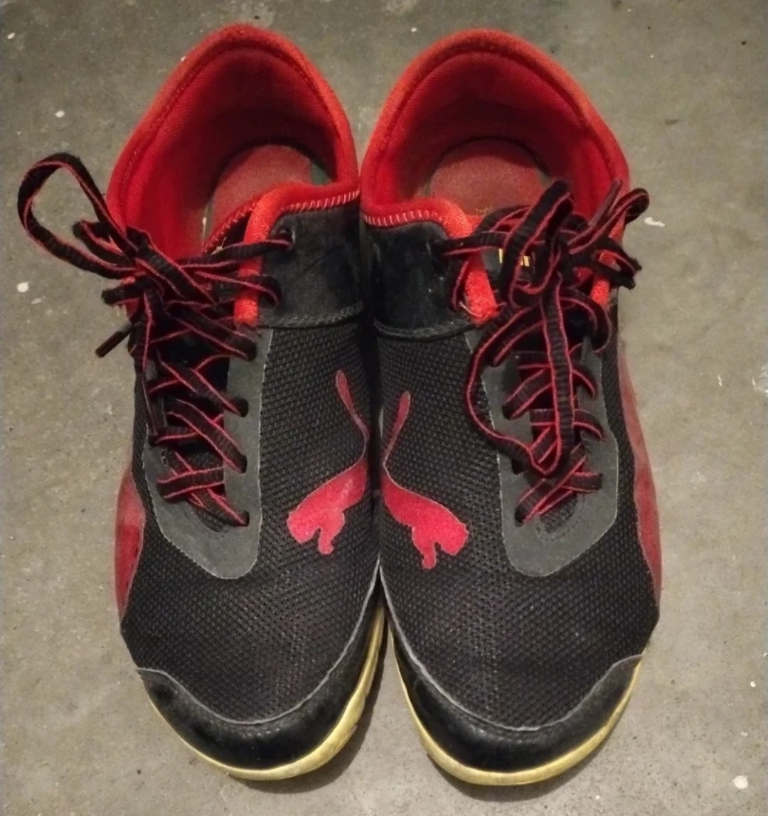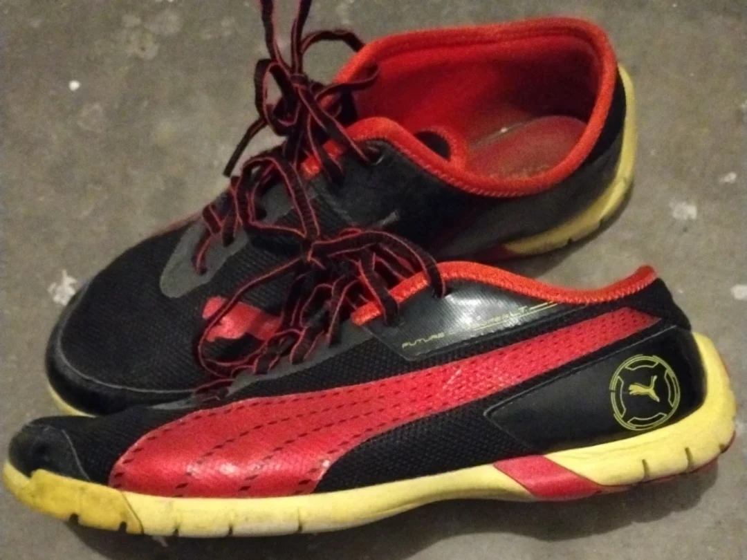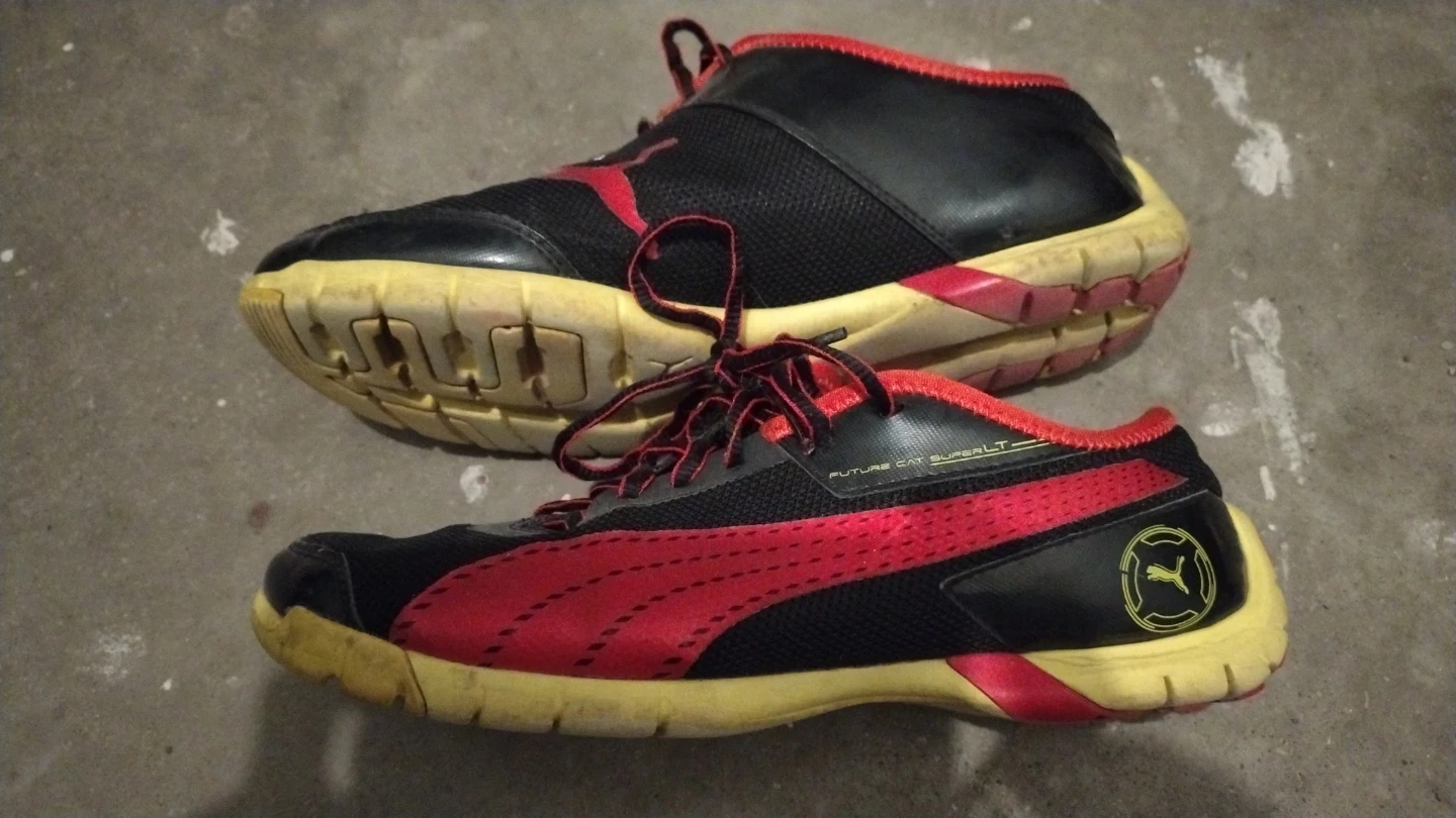 These men's Puma Future Cat Super LT shoes are black with red accents. They're designed for athletic wear, very light and flexible. Great for a quick run or casual use!