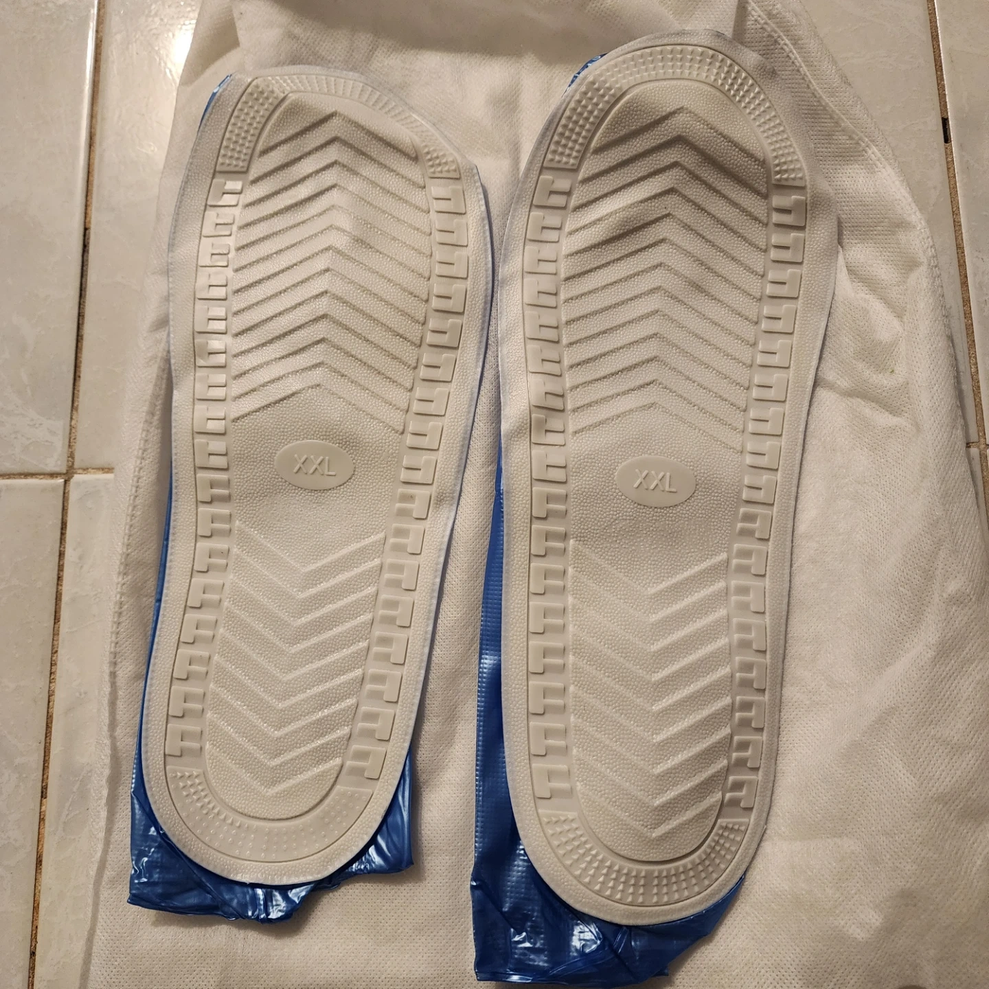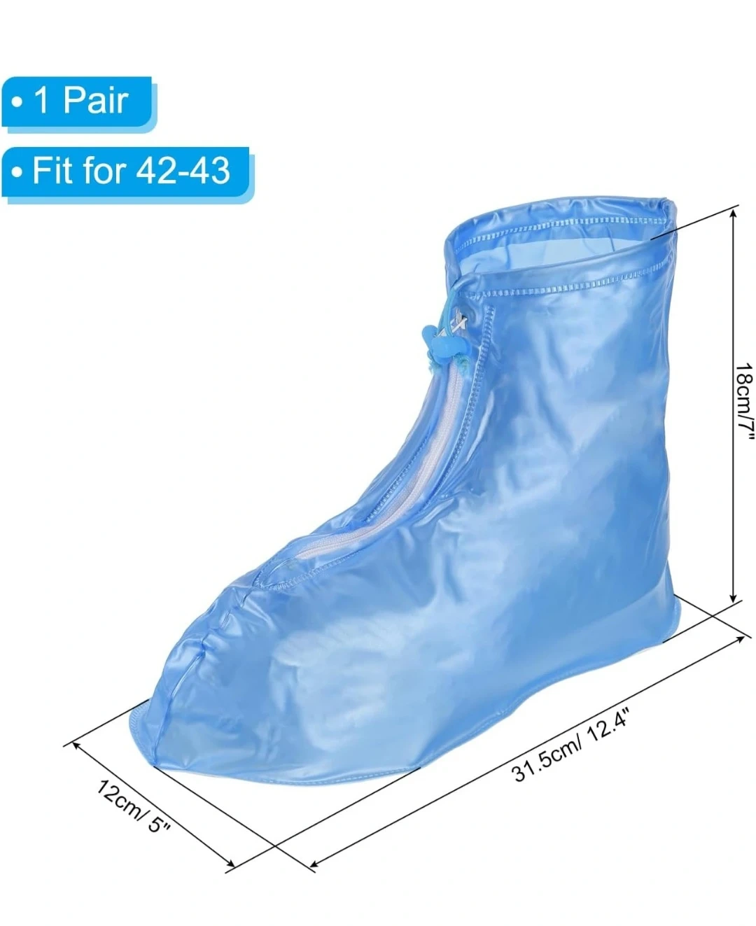 These shoe covers are made from waterproof PVC material. They're designed with a non-slip sole texture and a pull-resistant construction. The XXL size fits EU shoe sizes 42-43.