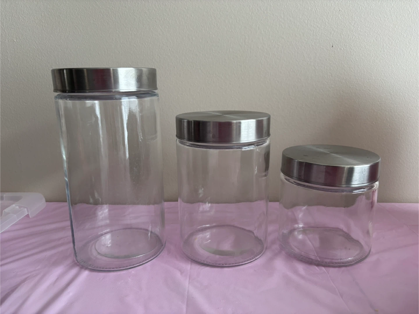 I have a whole bunch of clear glass storage jars, each topped with a brushed stainless steel lid. They're perfect for organizing your pantry or kitchen counter. The jars are made of durable glass and come with airtight lids to keep your contents fresh. These versatile jars are great for storing dry goods like flour, sugar, pasta, or coffee beans.