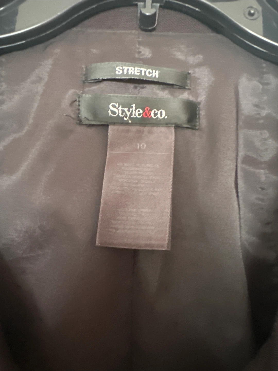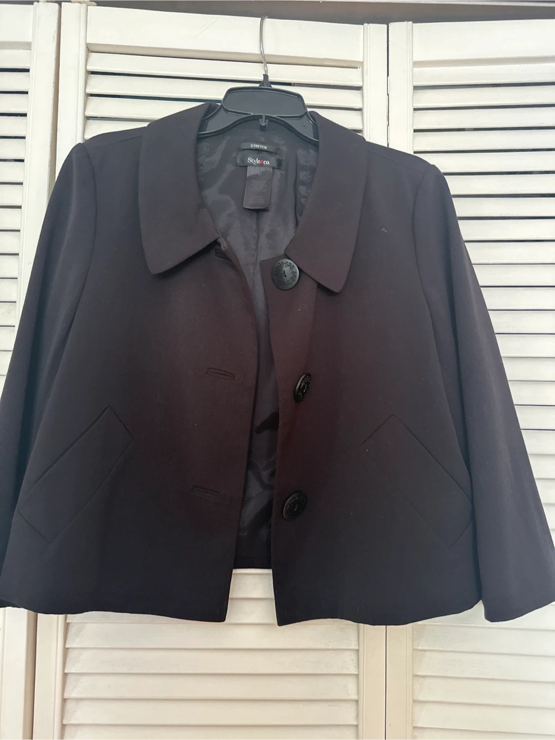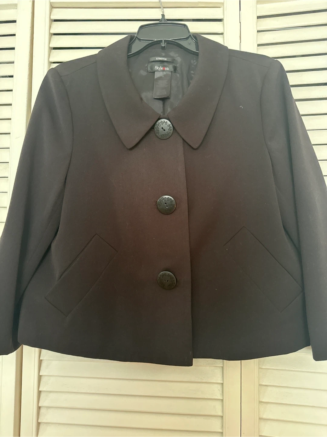 Selling a stylish Style&co. cropped jacket in a lovely black colour! It's a size 10 and features a classic button-up design. Perfect for layering or wearing on its own during those transitional weather days