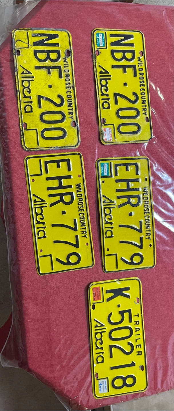 Collection of five old Alberta license plates from Wild Rose Country One plate is marked 'TRAILER'. Willing to sell separate or as a package price is for each. Will sell as package for $40. $10 each. Cash only