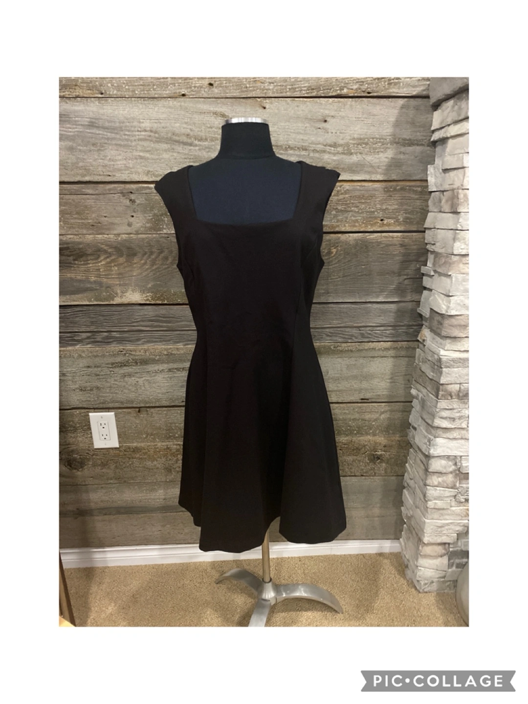 • Elegant black dress with a classic U neckline and a zippered back for a sleek, tailored look.
