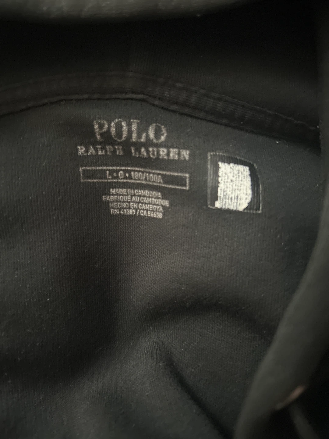 This is a black full zip hoodie from Polo Ralph Lauren. It's a size L (180/100A) and made in Cambodia. It features the classic Polo Ralph Lauren logo on the chest. Perfect for casual wear or layering!