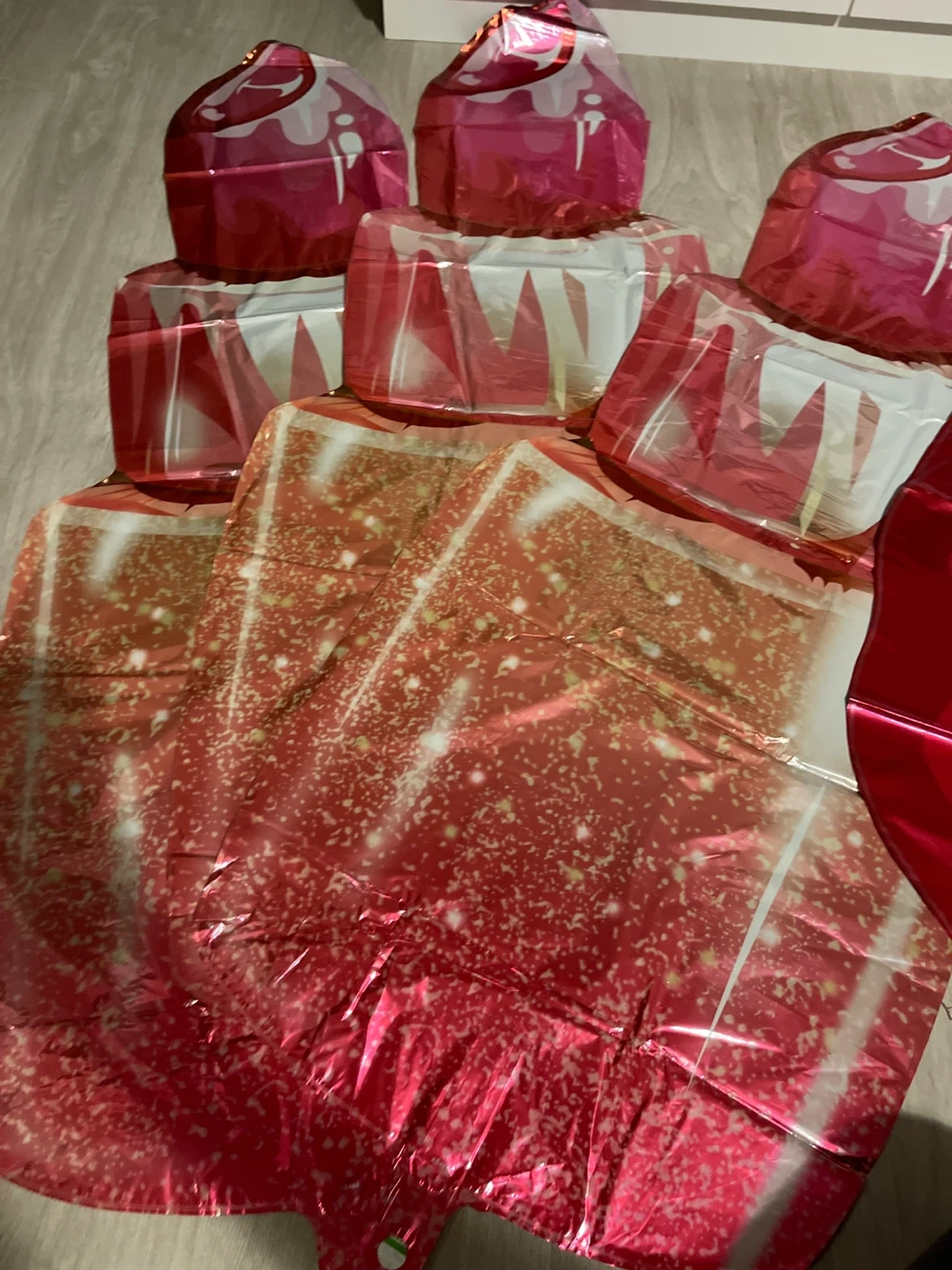 Brand new foil balloon set! Includes 3lipstick-shaped balloons (46cm/18inch) and 3 lip-shaped balloons (70cm/28inch). Also comes with a ribbon and straw for easy inflation