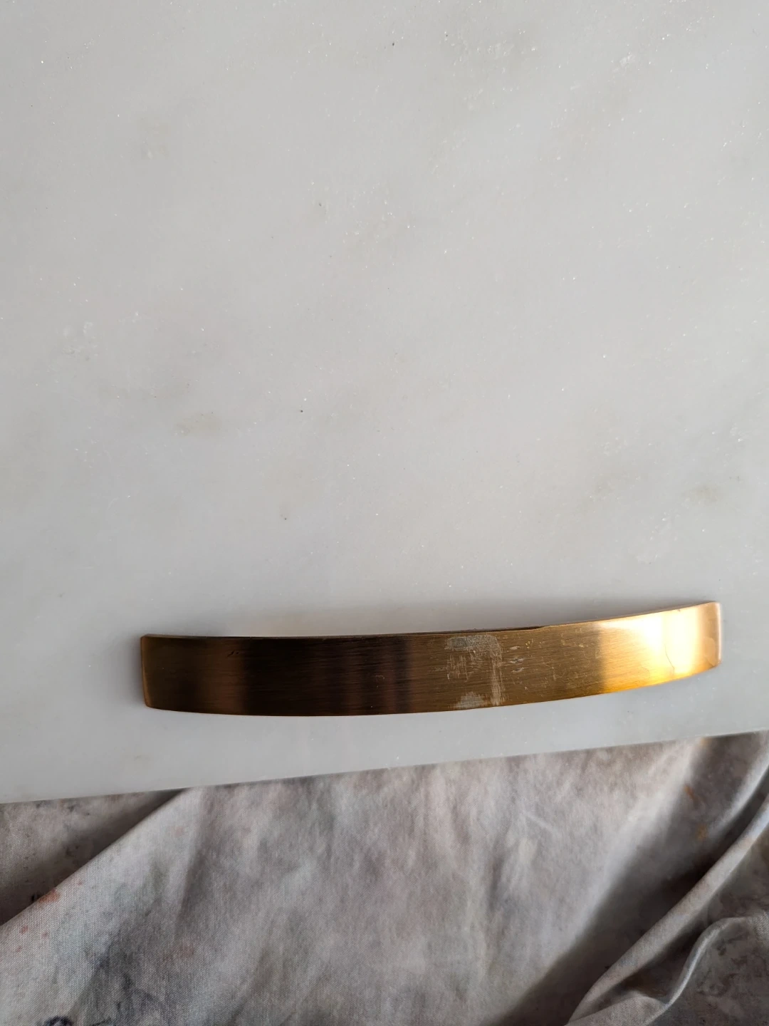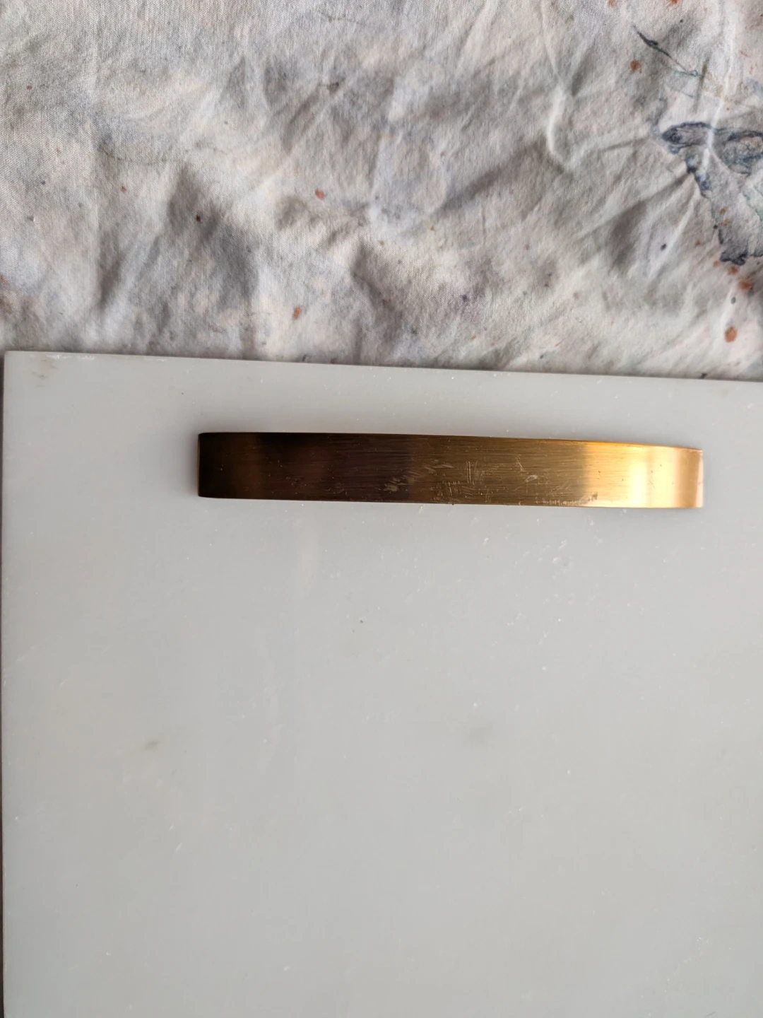 White marble serving tray featuring elegant gold-tone handles on each side. It's made from durable marble and includes protective feet on the bottom. Definitely has weight to it.