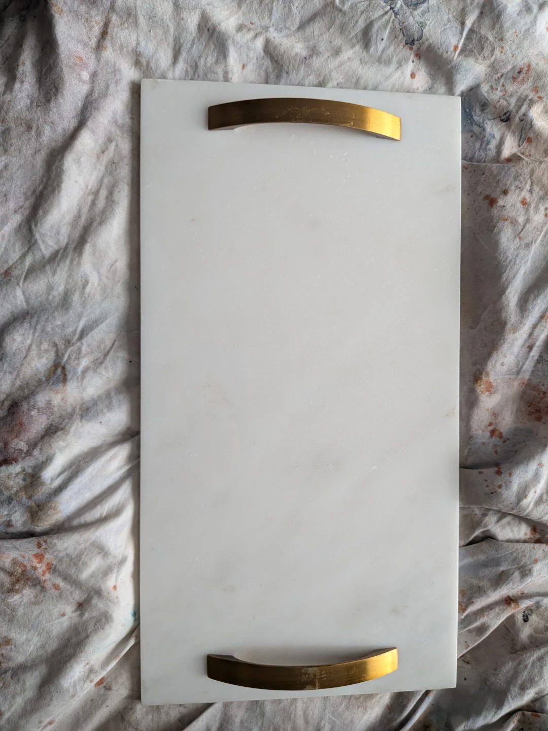 White marble serving tray featuring elegant gold-tone handles on each side. It's made from durable marble and includes protective feet on the bottom. Definitely has weight to it.