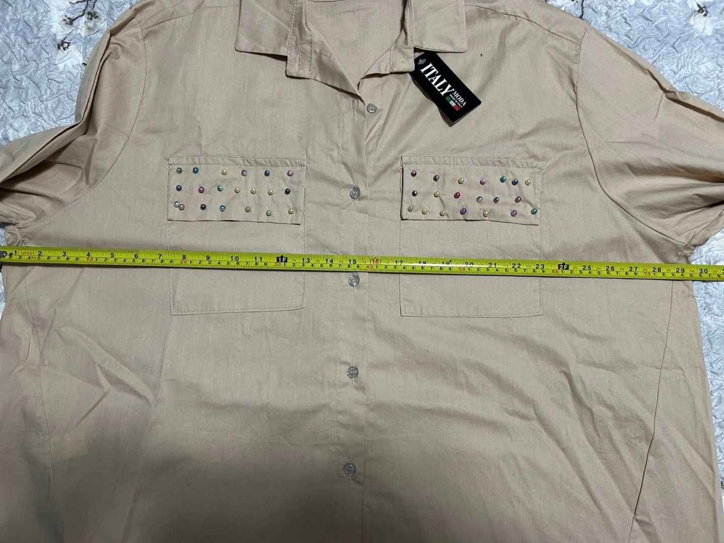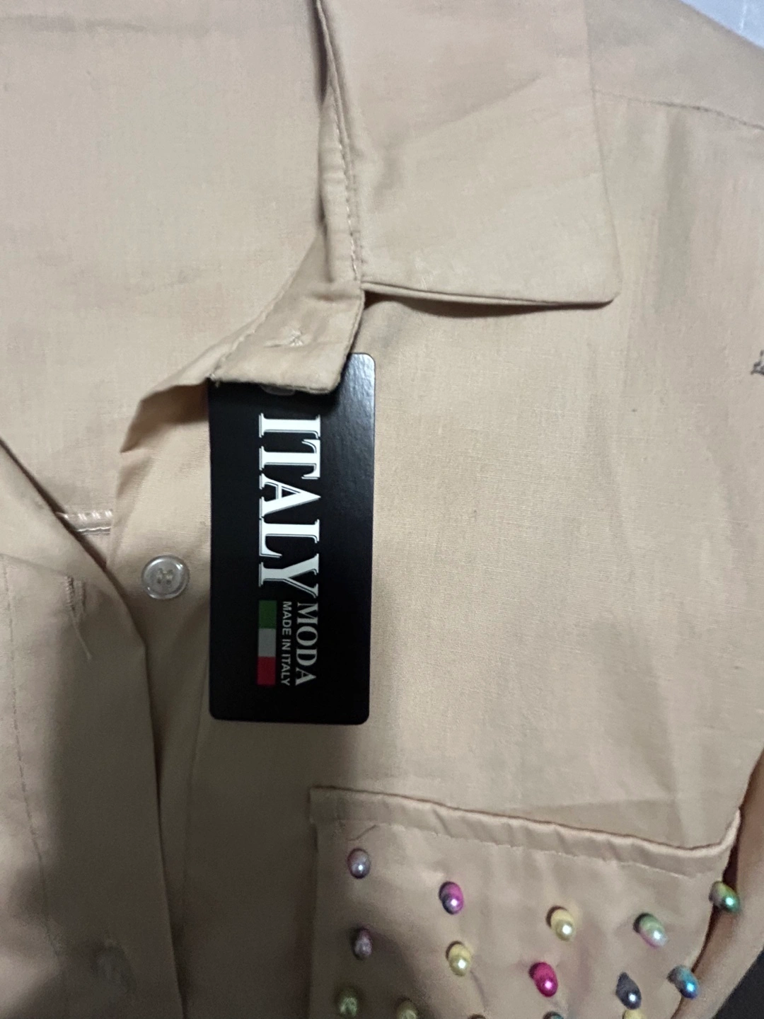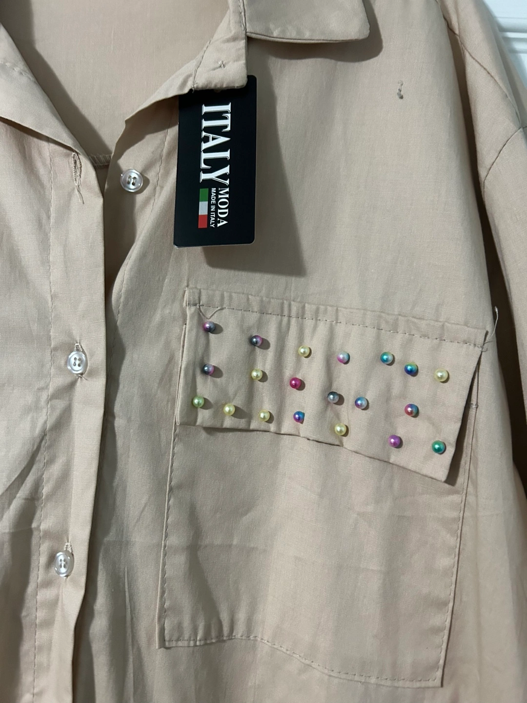 New from Europe stylish beige overshirt from Italy Moda! It features unique pearl embellishments on pockets adding style to a classic.