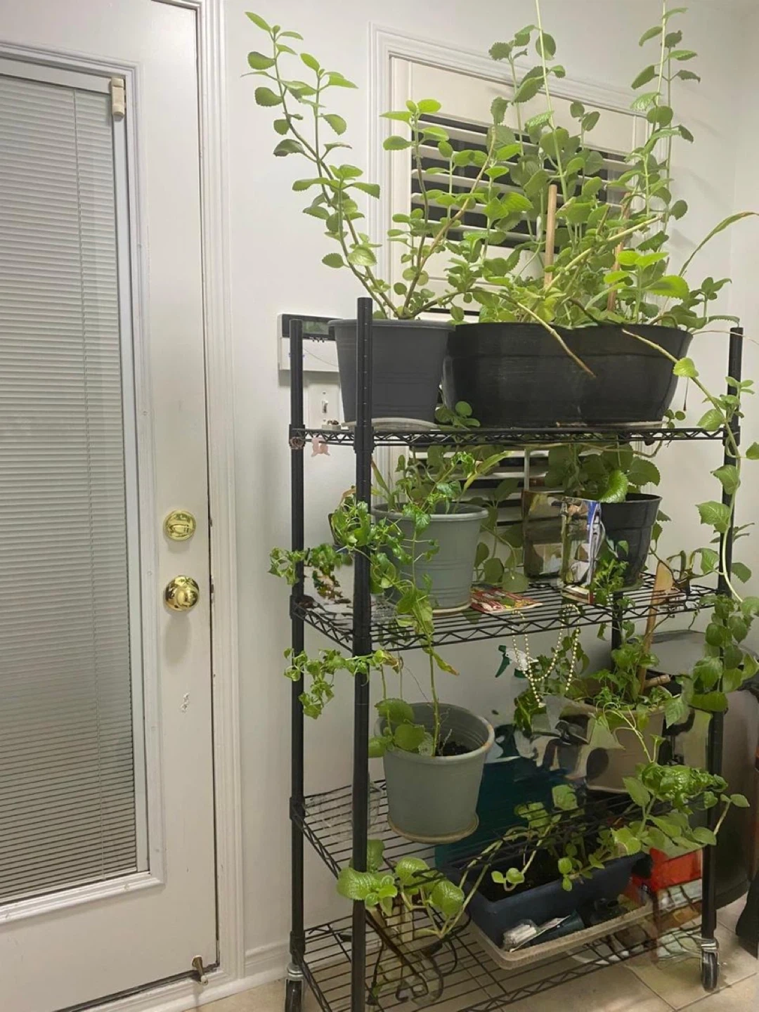 Metal stand which is currently used as planter stand can be used for any storage in Garage as well