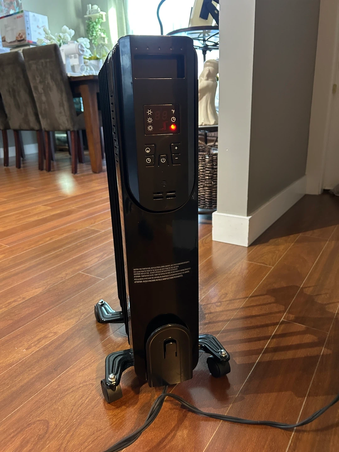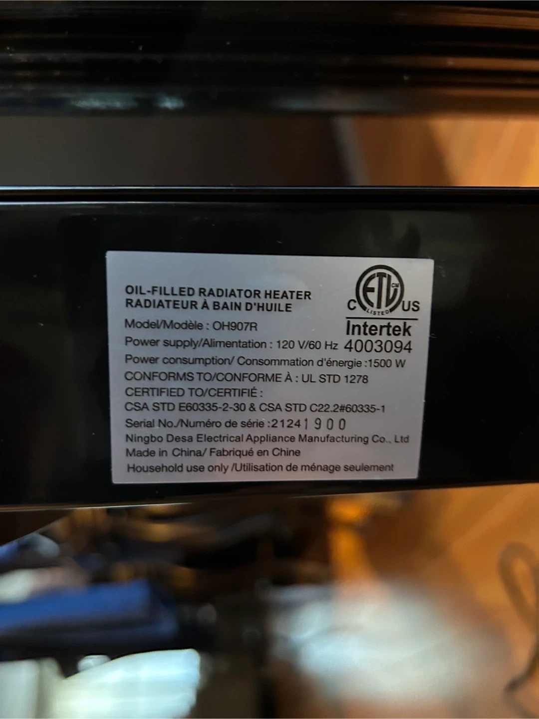 Selling an oil-filled radiator heater, model OH907R. It has a power supply of 120 V/60 Hz and a power consumption of 1500 W. Great for keeping a room warm and cozy during the colder months!