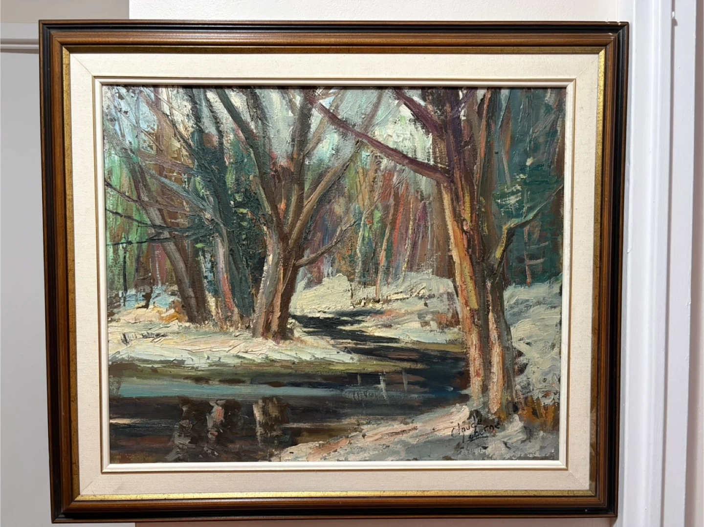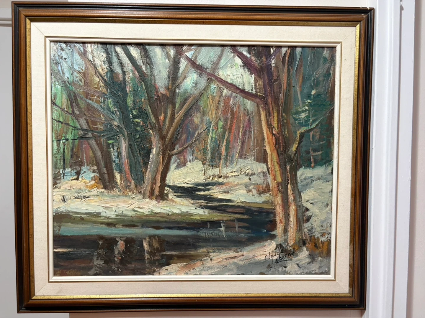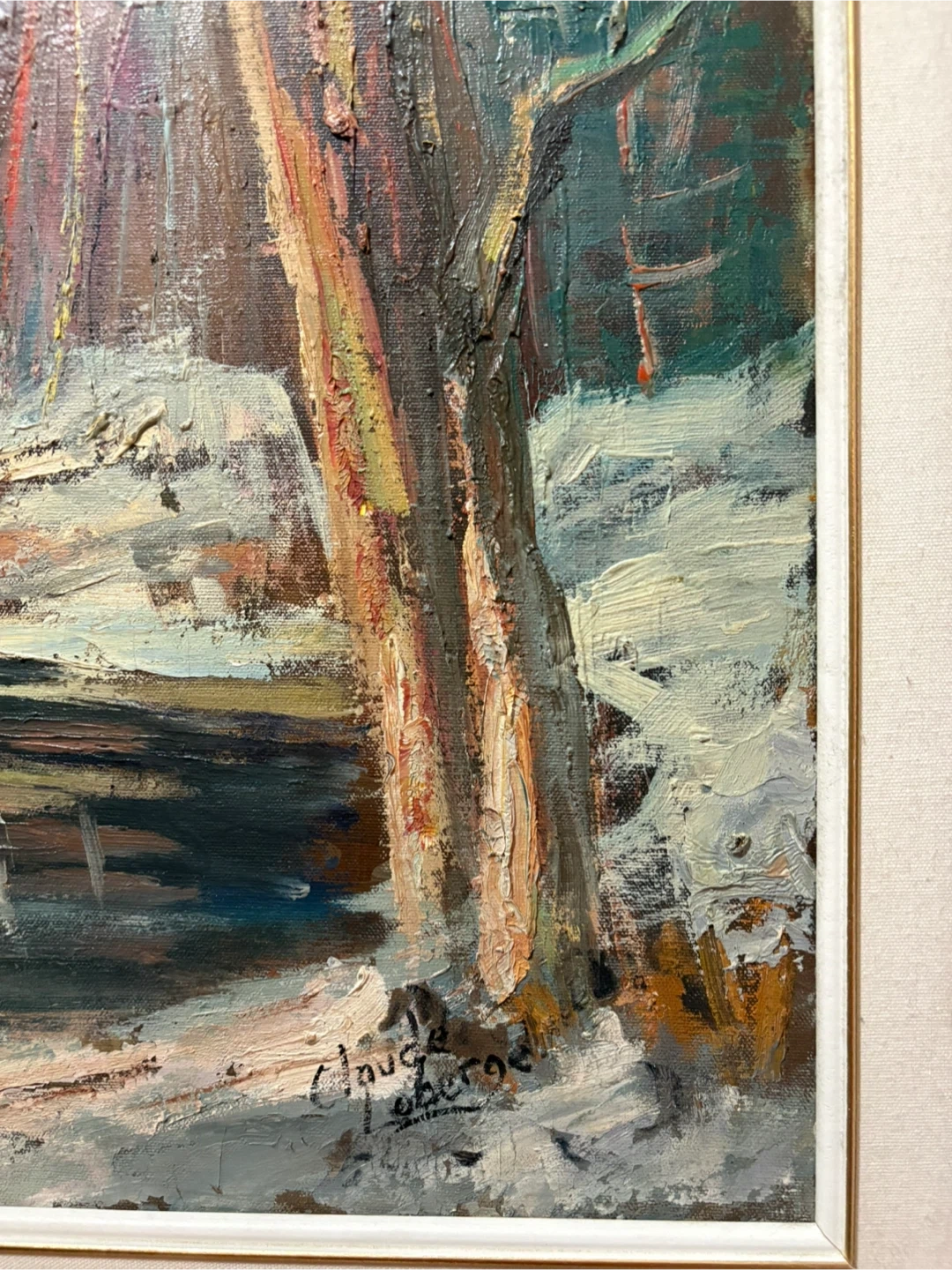 102Rustic oil painting of winter scene, river running through woods by Claude Leberge. Approximately 30” wide x 26” high; fabric mount with gold detail, wooden frame. Excellent condition.