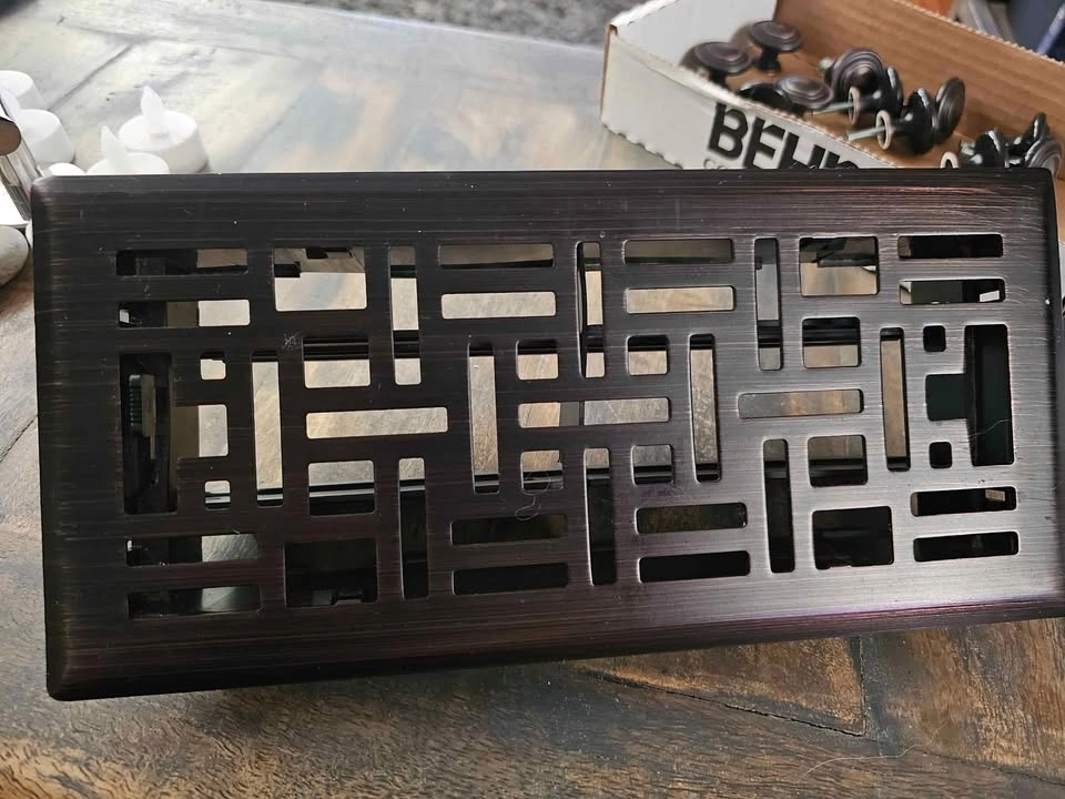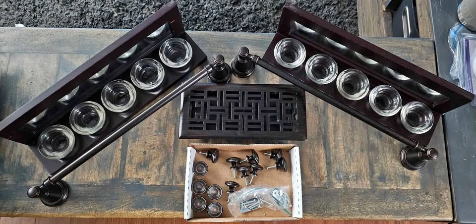 A great set for a bathroom, we have changed colours. Includes: Oil Rubbed Bronze 4×10 Floor Vent 2 - Oil Rubbed Bronze 16" Towel Bars 13 - Oil Rubbed Bronze Door Pulls 2 - Espresso Mirrored Wall Candle Holders.
