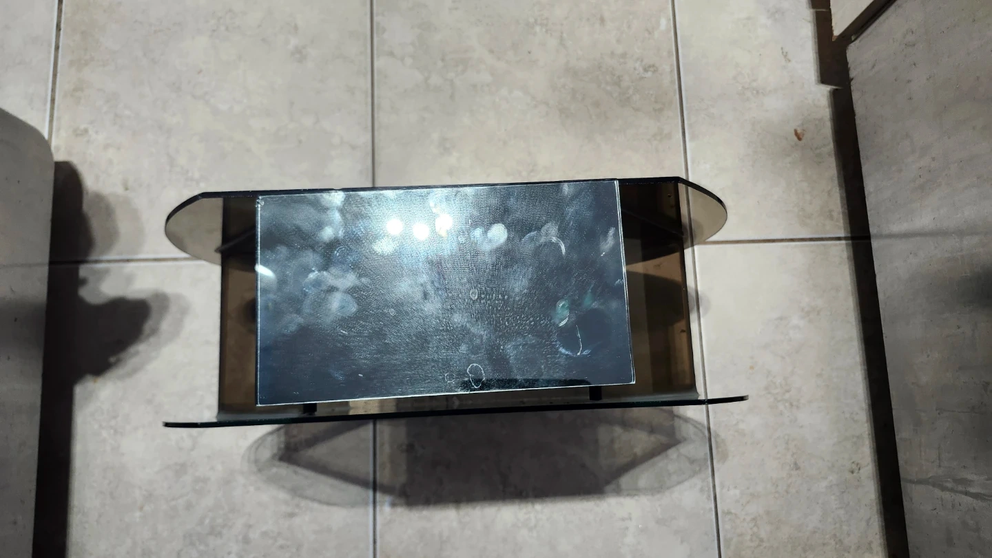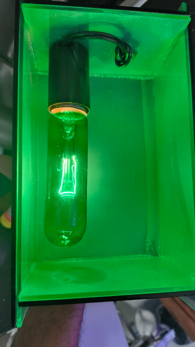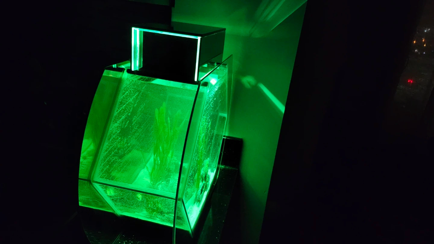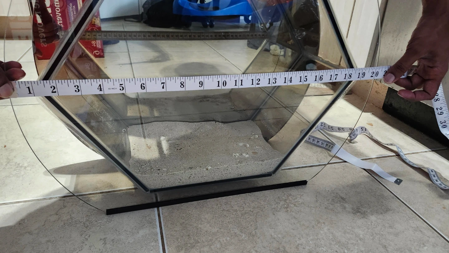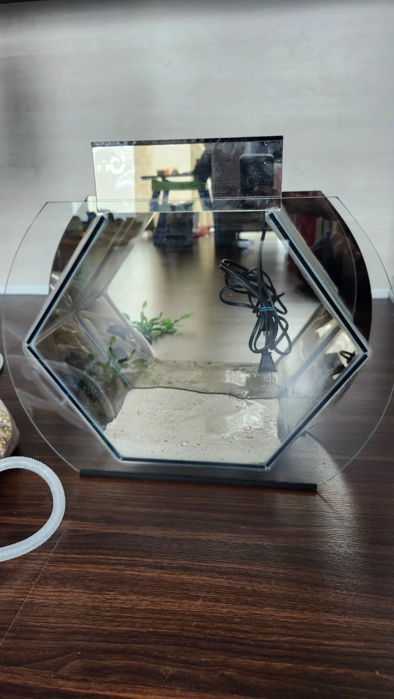 This unique hexagonal glass aquarium comes with a vibrant green LED light. It measures approximately 20 inches across at its widest point and 6 inches in height. Includes decorative plant and rock. Small chipped on top back side.