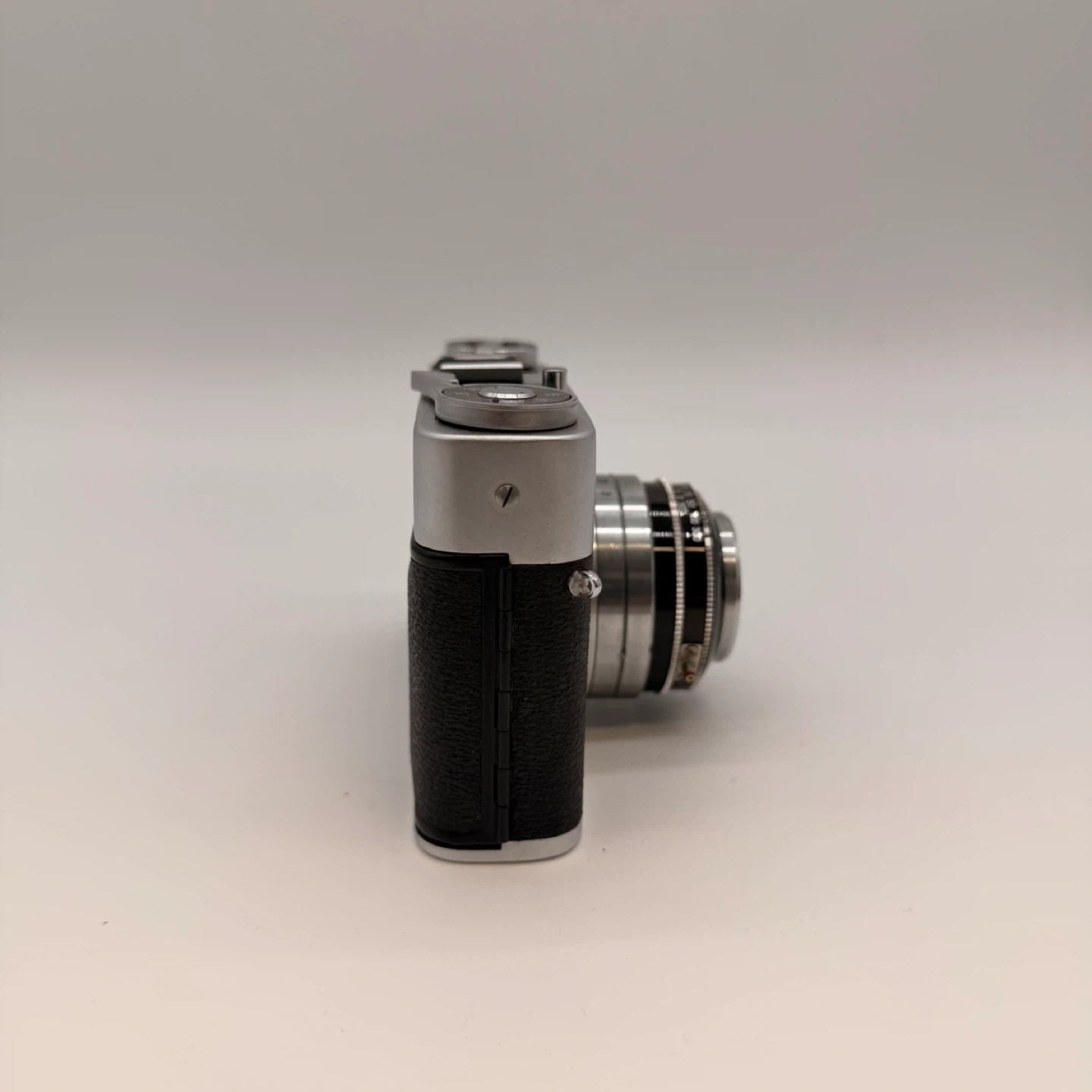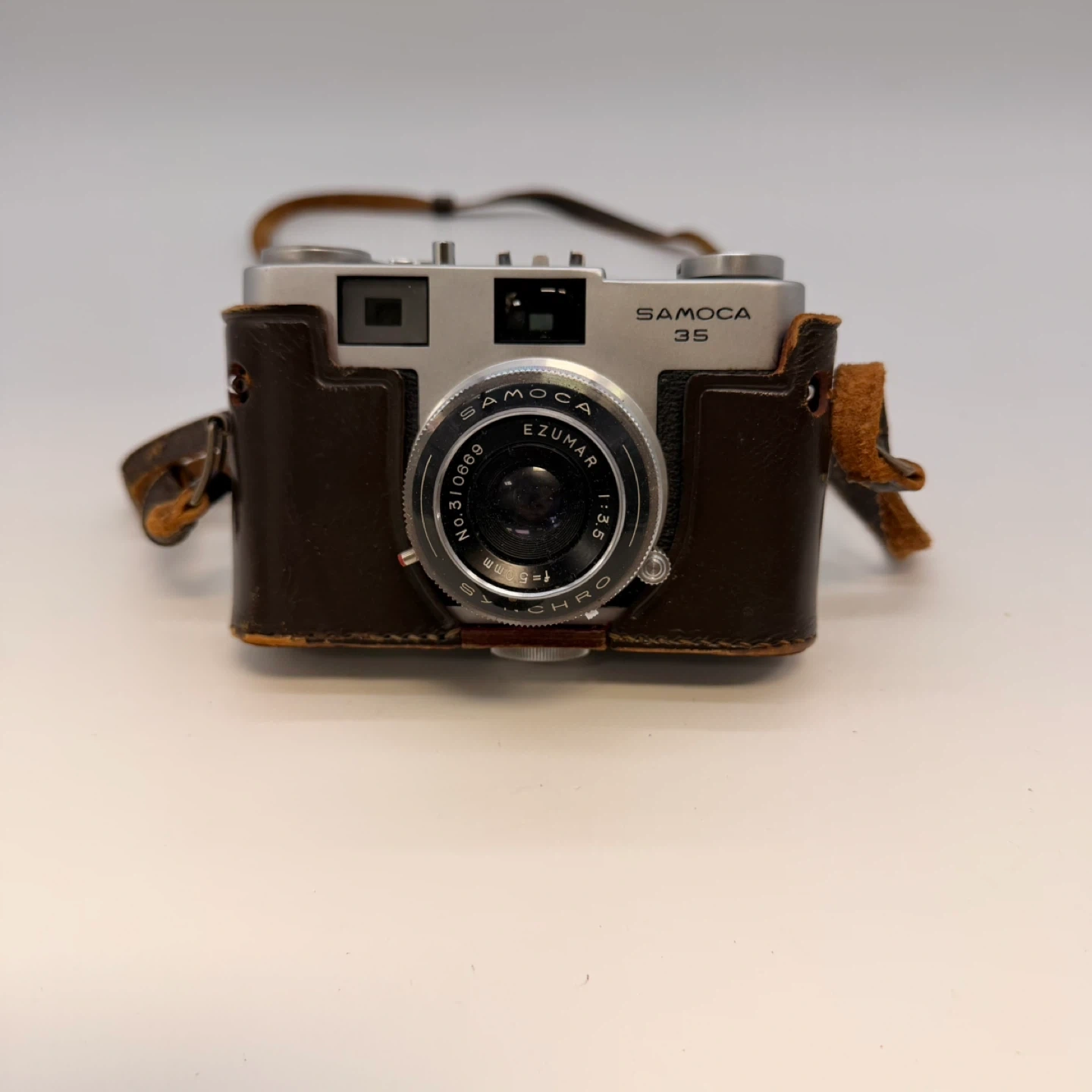 This classic compact camera features the original Samoca Ezumar 50mm f/3.5 lens and a beautiful metal body with black leatherette covering.