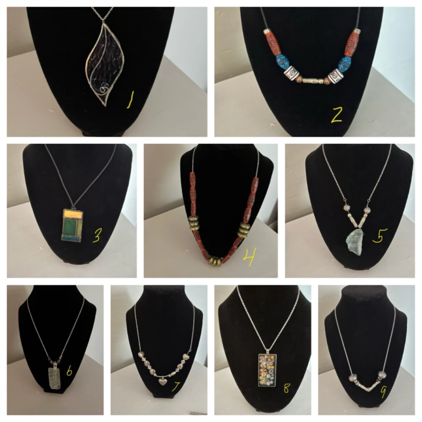 This lot includes nine unique necklaces. Designs vary from stained glass pendants and mosaic tiles to beaded and natural stone elements. Each necklace is on a silver-tone chain or cord.
