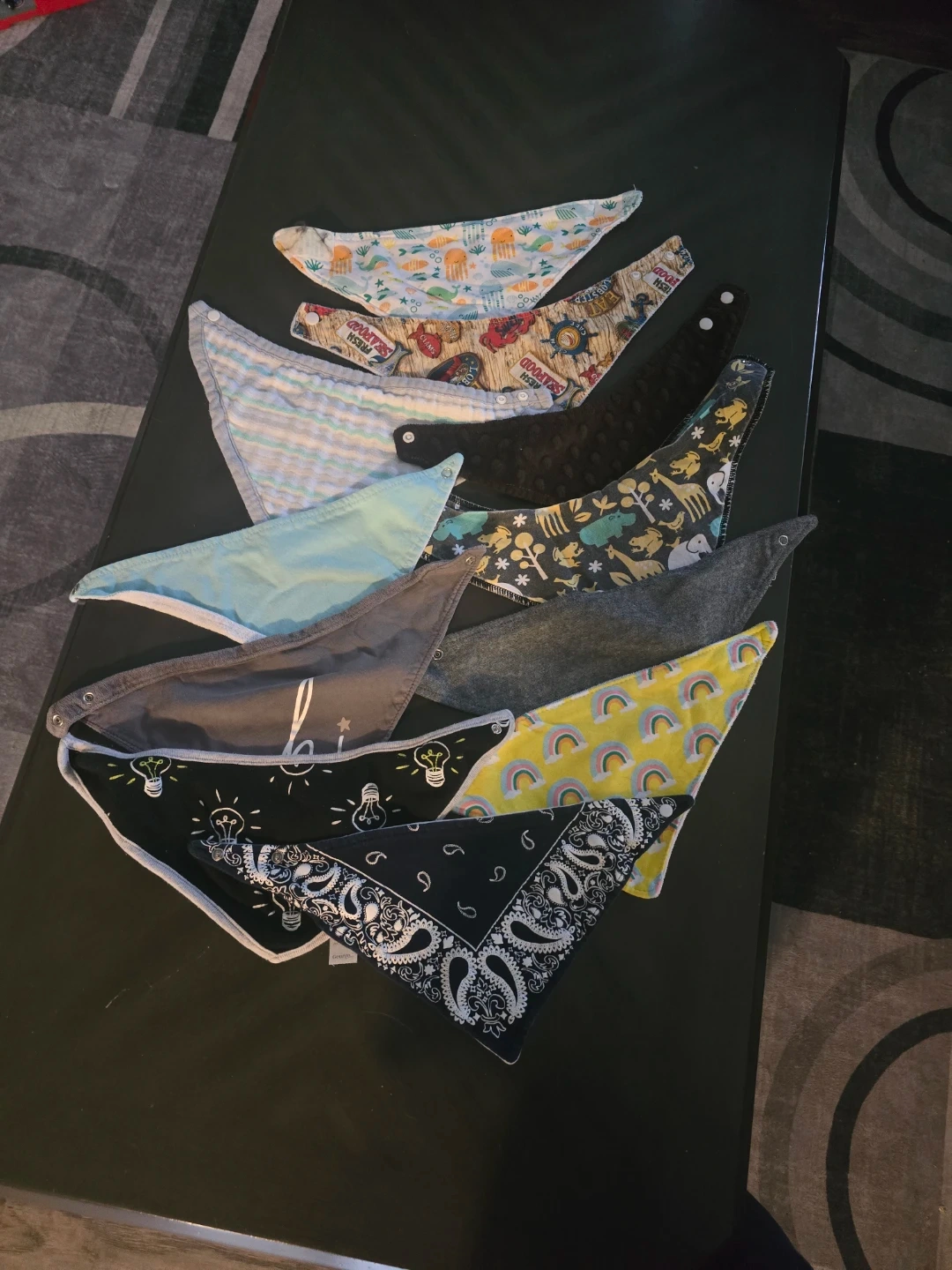 Lot of 9 baby bibs with various patterns. Includes cartoon animals, sea creatures, rainbows, lightbulbs, and paisley designs. These are snap closure bibs.